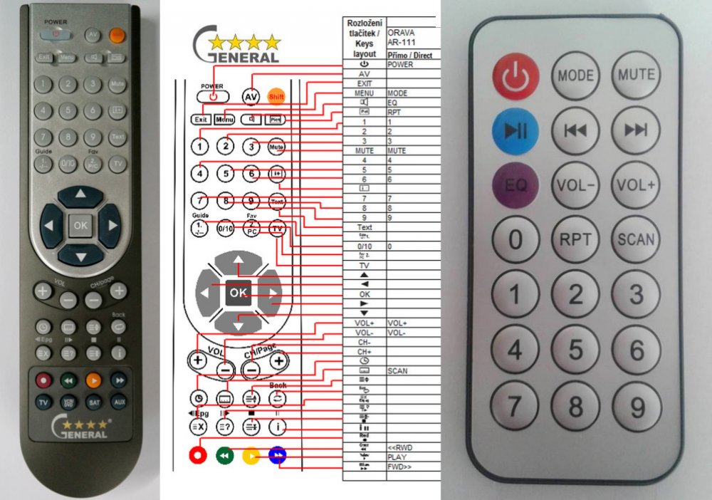 Náhradní dálkový ovladač ORAVA AR-111 (AR111) - 100procent náhrada 1:1 za originální dálkový ovladač. Ovladač je dodáván ve verzi značkového dálkového ovladače General 4 (zobrazen vlevo). Garantujeme Vám, že dostanete ovladač, který plně nahradí Váš původní originální ovladač a bude mít naprosto všechny funkce. Není to univerzální ovladač, ale ovladač, který je naprogramován a přímo určen pro modely přístrojů uvedené výše. Není třeba žádné párování, žádné kódy. Obdržíte od nás ovladač, který je připraven k použití - jediné, co musíte udělat, je vložit baterie a ovladač hned funguje. Podívejte se na obrázek ovladače a ujistěte se, že jsou v tabulce všechny funkce jako na původním originálním ovladači. Jedná se o plnohodnotný náhradní dálkový ovladač (není to „univerzál“). Má naprosto všechny funkce přesně jako originální ovladač. Záruční lhůta na ovladač je 2 roky. Dodáván také jednoduchý návod s mapováním funkcí. DOPLŇKOVÁ FUNKCE: Tento dálkový ovladač je možno naprogramovat na 1-4 zařízení (celkem tedy 4). Budete moci jedním ovladačem ovládat několik různých přístrojů jedním ovladačem. Pokud nám do komentáře v objednávce napíšete modely dalších přístrojů, naprogramujeme Vám ovladač na všechny. Za tuto doplňkovou službu bude naúčtován příplatek k ceně ovladače 50 Kč: více informací V případě, že v budoucnu vyměníte/obměníte Vaši domácí elektroniku, jsme schopni Vám tento ovladač přeprogramovat na naprosto jakékoliv nové/á zařízení. Ovladač General přežije Váš stávající přístroj!