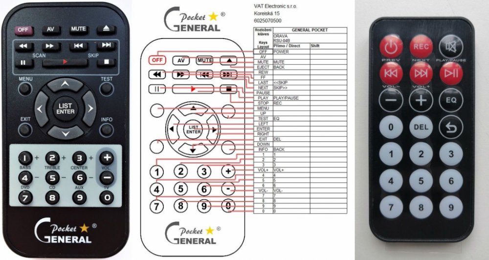 Náhradní dálkový ovladač ORAVA RSU-04B (RSU04B) - 100% náhrada 1:1 za originální dálkový ovladač. Dálkový ovladač byl vyvinut speciálně na míru pro tyto modely značky ORAVA:RSU-04B, RSU04B. (Nemusí zde být uvedeny úplně všechny kompatibilní modely. Pokud si nejste jisti, sdělte nám svůj model (použijte online chat, e-mail, telefon), neprodleně zkontrolujeme a ověříme, zda je tento ovladač kompatibilní s Vaším přístrojem. Za poskytnutou informaci ručíme.) Ovladač je dodáván ve verzi značkového dálkového ovladače General POCKET (zobrazen vlevo). Garantujeme Vám, že dostanete ovladač, který plně nahradí Váš původní originální ovladač a bude mít naprosto všechny funkce stejné.Není to univerzální ovladač, ale ovladač, který je naprogramován a přímo určen pro modely přístrojů uvedené výše. Není třeba žádné párování, žádné kódy. Obdržíte od nás ovladač, který je připraven k použití - jediné, co musíte udělat, je vložit baterie a ovladač hned funguje. Podívejte se na obrázek ovladače a ujistěte se, že jsou v tabulce všechny funkce jako na původním originálním ovladači. Jedná se o plnohodnotný náhradní dálkový ovladač (není to „univerzál“). Má naprosto všechny funkce přesně jako originální ovladač. Záruční lhůta na ovladač je 3 roky. Dodáván také jednoduchý návod s mapováním funkcí.
