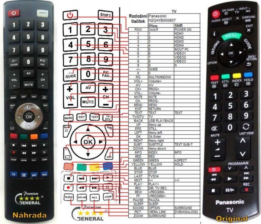 Náhradní dálkový ovladač PANASONIC N2QAYB000807. Je určen pro tyto modely PANASONIC:TX-L32EM5E, TX-L39EM5E, TX-L50EM5E, TX-L50M5E, TX-L55EM5E. (Nemusí zde být uvedeny úplně všechny kompatibilní modely. Pokud si nejste jisti, sdělte nám svůj model (použijte online chat, e-mail, telefon), neprodleně zkontrolujeme a ověříme, zda je tento ovladač kompatibilní s Vaším přístrojem. Za poskytnutou informaci ručíme.) Byl nahrazen kompatibilním dálkovým ovladačem N2QAYB000659 (zobrazen vlevo).Vysoká kvalita materiálu a zpracování, naprosto bezporuchový. Všechny naše dálkové ovladače kontrolujeme a testujeme, proto garantujeme jejich spolehlivost, nadstandartně dlouhý dosah signálu a výbornou citlivost tlačítek.Tento dálkový ovladač nemusíte nijak párovat, nevyžaduje žádné nastavování ani kódy. Stačí vložit baterie a funguje se všemi výše uvedenými modely.