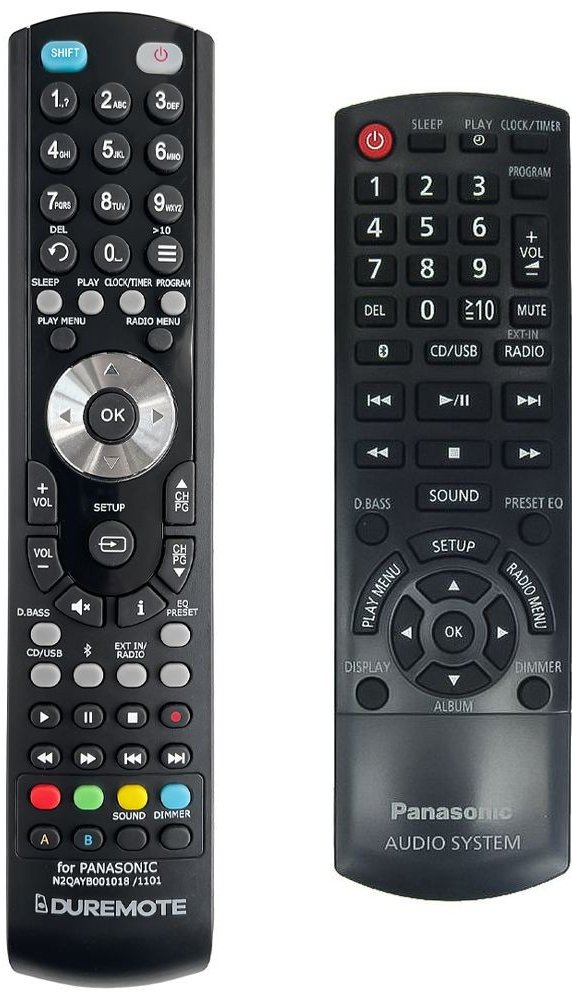 Náhradní dálkový ovladač PANASONIC N2QAYB001018 - 100procent náhrada 1:1 za originální dálkový ovladač. Dálkový ovladač je určen pro tyto modely PANASONIC: SC-PM100, SC-PMX100B, SC-PMX70, SC-PMX70B, SC-PMX80EG-K, SCPMX100B, SCPMX70B. (Nemusí zde být uvedeny úplně všechny kompatibilní modely. Pokud si nejste jisti, sdělte nám svůj model (použijte online chat, e-mail, telefon), neprodleně zkontrolujeme a ověříme, zda je tento ovladač kompatibilní s Vaším přístrojem. Za poskytnutou informaci ručíme.) Ovladač je dodáván ve verzi značkového dálkového ovladače General DVD/AUDIO (zobrazen vlevo). Garantujeme Vám, že dostanete ovladač, který plně nahradí Váš původní originální ovladač a bude mít naprosto všechny funkce. Není to univerzální ovladač, ale ovladač, který je naprogramován a přímo určen pro modely přístrojů uvedené výše. Není třeba žádné párování, žádné kódy. Obdržíte od nás ovladač, který je připraven k použití - jediné, co musíte udělat, je vložit baterie a ovladač hned funguje. Podívejte se na obrázek ovladače a ujistěte se, že jsou v tabulce všechny funkce jako na původním originálním ovladači. Jedná se o plnohodnotný náhradní dálkový ovladač (není to „univerzál“). Má naprosto všechny funkce přesně jako originální ovladač. Záruční lhůta na ovladač je 2 roky. Dodáván také jednoduchý návod s mapováním funkcí. DOPLŇKOVÁ FUNKCE: Tento dálkový ovladač je možno naprogramovat na 1 další přístroj. Budete moci jedním ovladačem ovládat oba přístroje (např. DVD plus TV nebo SOUNDBAR plus TV apod.). Pokud nám do komentáře v objednávce napíšete model dalšího přístroje, naprogramujeme Vám ovladač na oba. Za tuto doplňkovou službu bude naúčtován příplatek k ceně ovladače 50 Kč: více informací