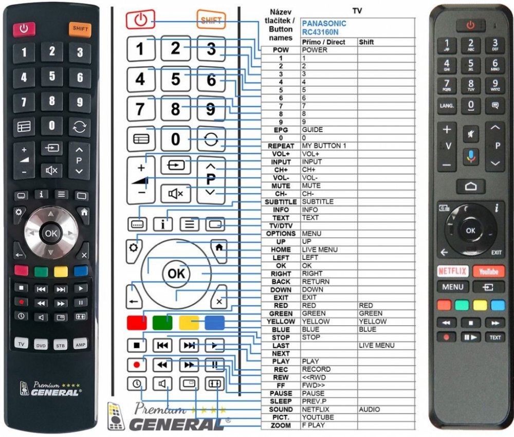 Náhradní dálkový ovladač PANASONIC RC43160N - 100% náhrada 1:1 za originální dálkový ovladač. Dálkový ovladač byl vyvinut speciálně na míru pro tyto modely značky PANASONIC:TX-43HX700E, TX-43HX702E, TX-43HX710E, TX-43HX712E, TX-50HX700E, TX-50HX702E, TX-50HX710E, TX-50HX712E, TX-55HX700E , TX-55HX702E , TX-55HX710E, TX-55HX712E, TX-65HX700E , TX-65HX702E, TX-65HX710E, TX-65HX712E. (Nemusí zde být uvedeny úplně všechny kompatibilní modely. Pokud si nejste jisti, sdělte nám svůj model (použijte online chat, e-mail, telefon), neprodleně zkontrolujeme a ověříme, zda je tento ovladač kompatibilní s Vaším přístrojem. Za poskytnutou informaci ručíme.) Ovladač je dodáván ve verzi značkového dálkového ovladače General Premium (zobrazen vlevo). Garantujeme Vám, že dostanete ovladač, který plně nahradí Váš původní originální ovladač a bude mít naprosto všechny funkce stejné.Není to univerzální ovladač, ale ovladač, který je naprogramován a přímo určen pro modely přístrojů uvedené výše. Není třeba žádné párování, žádné kódy. Obdržíte od nás ovladač, který je připraven k použití - jediné, co musíte udělat, je vložit baterie a ovladač hned funguje. Podívejte se na obrázek ovladače a ujistěte se, že jsou v tabulce všechny funkce jako na původním originálním ovladači. Jedná se o plnohodnotný náhradní dálkový ovladač (není to „univerzál“). Má naprosto všechny funkce přesně jako originální ovladač. Záruční lhůta na ovladač je 3 roky. Dodáván také jednoduchý návod s mapováním funkcí. DOPLŇKOVÁ FUNKCE: Tento dálkový ovladač je možno naprogramovat na 1-4 zařízení (celkem tedy 4). Budete moci jedním ovladačem ovládat několik různých přístrojů jedním ovladačem. Pokud nám do komentáře v objednávce napíšete modely dalších přístrojů, naprogramujeme Vám ovladač na všechny. Za tuto doplňkovou službu bude naúčtován příplatek k ceně ovladače 50 Kč: více informacíV případě, že v budoucnu vyměníte/obměníte Vaši domácí elektroniku, jsme schopni Vám tento ovladač přeprogramovat na ..