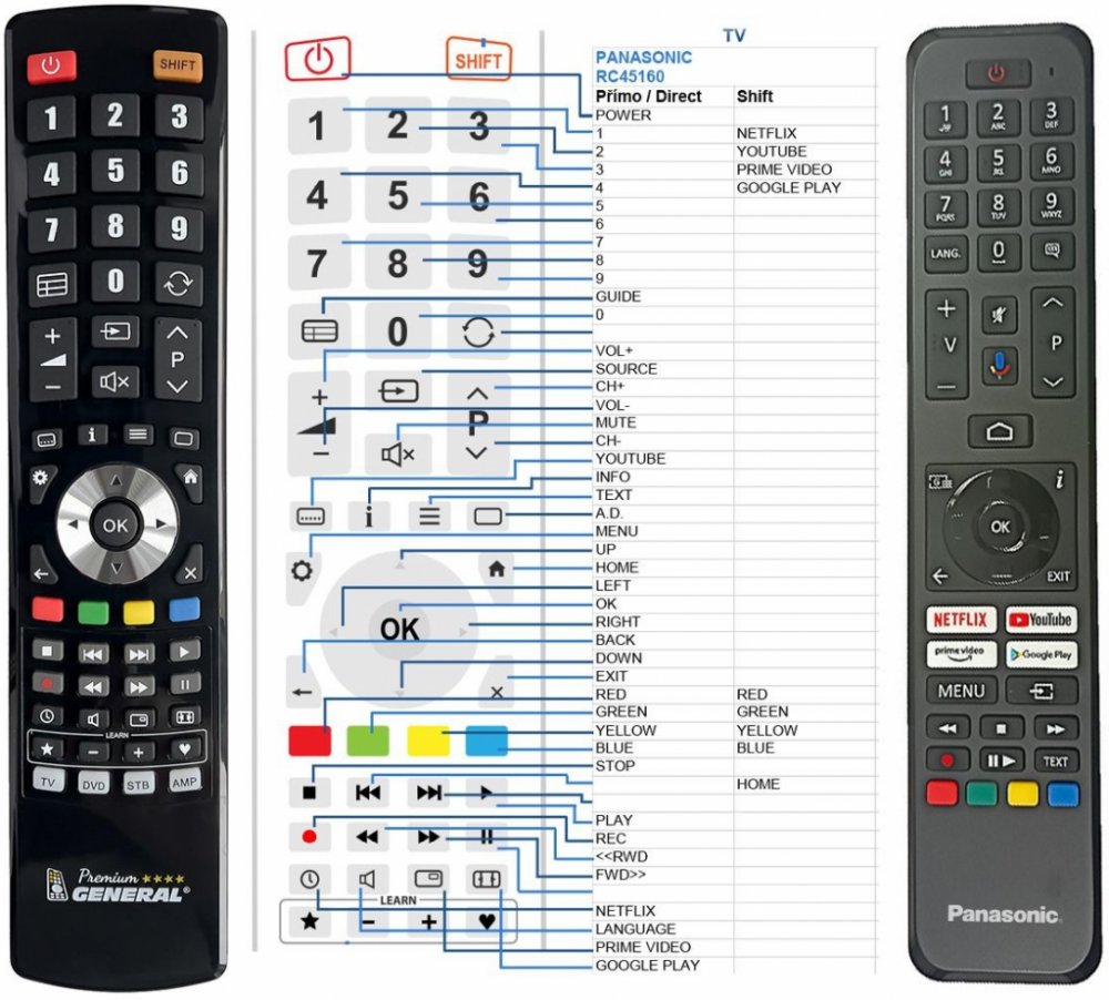 Náhradní dálkový ovladač PANASONIC RC45160 - 100% náhrada 1:1 za originální dálkový ovladač. Dálkový ovladač byl vyvinut speciálně na míru pro tyto modely značky PANASONIC:23748085, 30108046, RC43160N, RC45160, TX-40MS490E, TX-43HX700E, TX-43HX702E, TX-43HX710E, TX-43HX712E, TX-43LX650E, TX-43LX650EZ, TX-43LX660E, TX-43LX670E, TX-43MX700E, TX-43MX710E, TX-50HX700E, TX-50HX702E, TX-50HX710E, TX-50HX712E, TX-50LX650E, TX-50LX650EZ, TX-50LX660E, TX-50LX670E, TX-50MX700E, TX-50MX710E, TX-55HX700E , TX-55HX702E , TX-55HX710E, TX-55HX712E, TX-55LX650E, TX-55LX650EZ, TX-55LX660E, TX-55LX670E, TX-55MX700E, TX-55MX710E, TX-55MZ800, TX-55MZ800E, TX-65HX702E, TX-65HX710E, TX-65HX712E, TX-65LX650E, TX-65LX650EZ, TX-65LX660E, TX-65LX670E, TX-65MX700E, TX-65MX710E, TX-65MZ800E, TX40MS490E, TX43LX650E, TX43LX650EZ, TX43LX660E, TX43LX670E, TX43MX700E, TX43MX710E, TX50LX650E, TX50LX650EZ, TX50LX660E, TX50LX670E, TX50MX700E, TX50MX710E, TX55LX650E, TX55LX650EZ, TX55LX660E, TX55LX670E, TX55MX700E, TX55MX710E, TX65HX700E, TX65LX650E, TX65LX650EZ, TX65LX660E, TX65LX670E, TX65MX700E, TX65MX710E. (Nemusí zde být uvedeny úplně všechny kompatibilní modely. Pokud si nejste jisti, sdělte nám svůj model (použijte online chat, e-mail, telefon), neprodleně zkontrolujeme a ověříme, zda je tento ovladač kompatibilní s Vaším přístrojem. Za poskytnutou informaci ručíme.) Ovladač je dodáván ve verzi značkového dálkového ovladače General Premium (zobrazen vlevo). Garantujeme Vám, že dostanete ovladač, který plně nahradí Váš původní originální ovladač a bude mít naprosto všechny funkce stejné.Není to univerzální ovladač, ale ovladač, který je naprogramován a přímo určen pro modely přístrojů uvedené výše. Není třeba žádné párování, žádné kódy. Obdržíte od nás ovladač, který je připraven k použití - jediné, co musíte udělat, je vložit baterie a ovladač hned funguje. Podívejte se na obrázek ovladače a ujistěte se, že jsou v tabulce všechny funkce jako na původním originálním ovladači. Jedná se o plnohodnotný náhradní ..