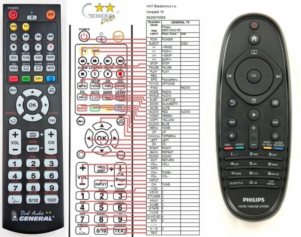 Náhradní dálkový ovladač PHILIPS 996510037248 - 100procent náhrada 1:1 za originální dálkový ovladač. Dálkový ovladač je určen pro tyto modely PHILIPS: HTS5220, HTS5220/12, HTS5220/51, HTS5560/12, HTS5590, HTS5590/12. (Nemusí zde být uvedeny úplně všechny kompatibilní modely. Pokud si nejste jisti, sdělte nám svůj model (použijte online chat, e-mail, telefon), neprodleně zkontrolujeme a ověříme, zda je tento ovladač kompatibilní s Vaším přístrojem. Za poskytnutou informaci ručíme.) Ovladač je dodáván ve verzi značkového dálkového ovladače General DVD/AUDIO (zobrazen vlevo). Garantujeme Vám, že dostanete ovladač, který plně nahradí Váš původní originální ovladač a bude mít naprosto všechny funkce. Není to univerzální ovladač, ale ovladač, který je naprogramován a přímo určen pro modely přístrojů uvedené výše. Není třeba žádné párování, žádné kódy. Obdržíte od nás ovladač, který je připraven k použití - jediné, co musíte udělat, je vložit baterie a ovladač hned funguje. Podívejte se na obrázek ovladače a ujistěte se, že jsou v tabulce všechny funkce jako na původním originálním ovladači. Jedná se o plnohodnotný náhradní dálkový ovladač (není to „univerzál“). Má naprosto všechny funkce přesně jako originální ovladač. Záruční lhůta na ovladač je 2 roky. Dodáván také jednoduchý návod s mapováním funkcí. DOPLŇKOVÁ FUNKCE: Tento dálkový ovladač je možno naprogramovat na 1 další přístroj. Budete moci jedním ovladačem ovládat oba přístroje (např. DVD plus TV nebo SOUNDBAR plus TV apod.). Pokud nám do komentáře v objednávce napíšete model dalšího přístroje, naprogramujeme Vám ovladač na oba. Za tuto doplňkovou službu bude naúčtován příplatek k ceně ovladače 50 Kč: více informací