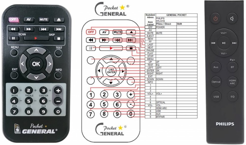 Náhradní dálkový ovladač PHILIPS HTL3310 - 100% náhrada 1:1 za originální dálkový ovladač. Dálkový ovladač byl vyvinut speciálně na míru pro tyto modely značky PHILIPS:HTL3310, HTL3320, HTL3325. (Nemusí zde být uvedeny úplně všechny kompatibilní modely. Pokud si nejste jisti, sdělte nám svůj model (použijte online chat, e-mail, telefon), neprodleně zkontrolujeme a ověříme, zda je tento ovladač kompatibilní s Vaším přístrojem. Za poskytnutou informaci ručíme.) Ovladač je dodáván ve verzi značkového dálkového ovladače General POCKET (zobrazen vlevo). Garantujeme Vám, že dostanete ovladač, který plně nahradí Váš původní originální ovladač a bude mít naprosto všechny funkce stejné.Není to univerzální ovladač, ale ovladač, který je naprogramován a přímo určen pro modely přístrojů uvedené výše. Není třeba žádné párování, žádné kódy. Obdržíte od nás ovladač, který je připraven k použití - jediné, co musíte udělat, je vložit baterie a ovladač hned funguje. Podívejte se na obrázek ovladače a ujistěte se, že jsou v tabulce všechny funkce jako na původním originálním ovladači. Jedná se o plnohodnotný náhradní dálkový ovladač (není to „univerzál“). Má naprosto všechny funkce přesně jako originální ovladač. Záruční lhůta na ovladač je 3 roky. Dodáván také jednoduchý návod s mapováním funkcí.