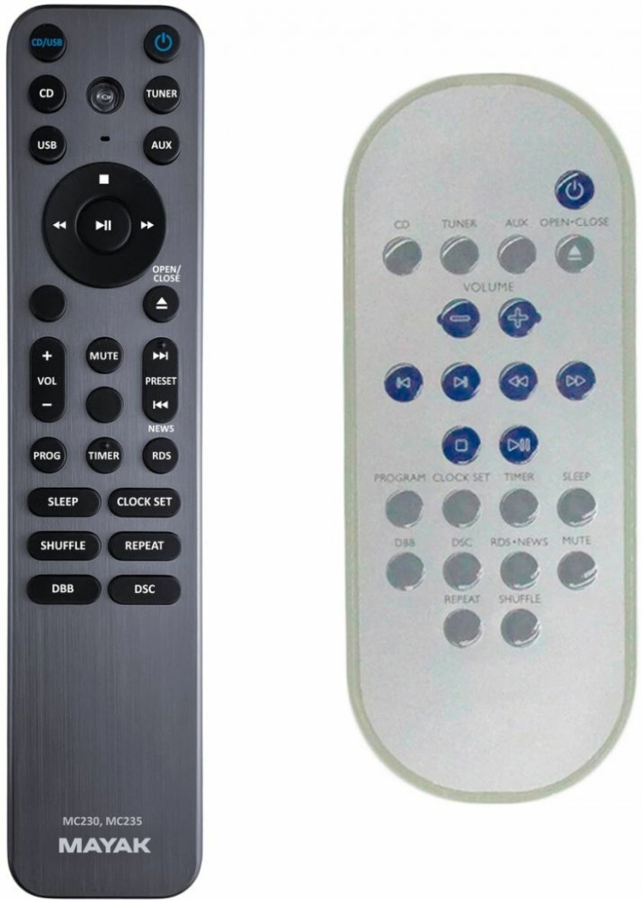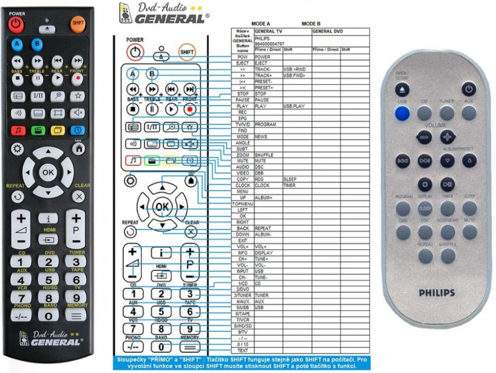 Náhradní dálkový ovladač PHILIPS MC230, MC235, MCD139, MCM275 - 100% náhrada 1:1 za originální dálkový ovladač. Dálkový ovladač je určen pro tyto modely PHILIPS:MC230, MC230E, MC235, MCD139B/12, MCM275, MCM275/12. (Nemusí zde být uvedeny úplně všechny kompatibilní modely. Pokud si nejste jisti, sdělte nám svůj model (použijte online chat, e-mail, telefon), neprodleně zkontrolujeme a ověříme, zda je tento ovladač kompatibilní s Vaším přístrojem. Za poskytnutou informaci ručíme.)Plně nahrazuje také tyto dálkové ovladače: 994000000246, 99400002008, 994000004797, 996510002032Ovladač je dodáván ve verzi značkového dálkového ovladače General DVD/AUDIO (zobrazen vlevo). Garantujeme Vám, že dostanete ovladač, který plně nahradí Váš původní originální ovladač a bude mít naprosto všechny funkce stejné.Není to univerzální ovladač, ale ovladač, který je naprogramován a přímo určen pro modely přístrojů uvedené výše. Není třeba žádné párování, žádné kódy. Obdržíte od nás ovladač, který je připraven k použití - jediné, co musíte udělat, je vložit baterie a ovladač hned funguje. Podívejte se na obrázek ovladače a ujistěte se, že jsou v tabulce všechny funkce jako na původním originálním ovladači. Jedná se o plnohodnotný náhradní dálkový ovladač (není to „univerzál“). Má naprosto všechny funkce přesně jako originální ovladač. Záruční lhůta na ovladač je 3 roky. Dodáván také jednoduchý návod s mapováním funkcí. DOPLŇKOVÁ FUNKCE: Tento dálkový ovladač je možno naprogramovat na 1 další přístroj. Budete moci jedním ovladačem ovládat oba přístroje (např. DVD+TV nebo SOUNDBAR+TV apod.). Pokud nám do komentáře v objednávce napíšete model dalšího přístroje, naprogramujeme Vám ovladač na oba. Za tuto doplňkovou službu bude naúčtován příplatek k ceně ovladače 50 Kč: více informací