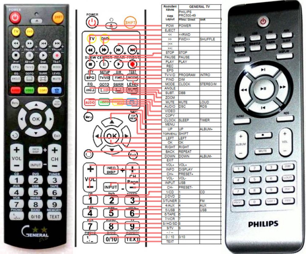 Náhradní dálkový ovladač PHILIPS PRC500-49, 996510018455 (PRC50049, 996510018455) - 100% náhrada 1:1 za originální dálkový ovladač. Dálkový ovladač byl vyvinut speciálně na míru pro tyto modely značky PHILIPS:AZ 780, AZ-780, AZ780, FWM387, MCM700/12, MCM710, MCM770, MCM770/12, MCM772, MCM772/12. (Nemusí zde být uvedeny úplně všechny kompatibilní modely. Pokud si nejste jisti, sdělte nám svůj model (použijte online chat, e-mail, telefon), neprodleně zkontrolujeme a ověříme, zda je tento ovladač kompatibilní s Vaším přístrojem. Za poskytnutou informaci ručíme.) Ovladač je dodáván ve verzi značkového dálkového ovladače General DVD/AUDIO (zobrazen vlevo). Garantujeme Vám, že dostanete ovladač, který plně nahradí Váš původní originální ovladač a bude mít naprosto všechny funkce stejné.Není to univerzální ovladač, ale ovladač, který je naprogramován a přímo určen pro modely přístrojů uvedené výše. Není třeba žádné párování, žádné kódy. Obdržíte od nás ovladač, který je připraven k použití - jediné, co musíte udělat, je vložit baterie a ovladač hned funguje. Podívejte se na obrázek ovladače a ujistěte se, že jsou v tabulce všechny funkce jako na původním originálním ovladači. Jedná se o plnohodnotný náhradní dálkový ovladač (není to „univerzál“). Má naprosto všechny funkce přesně jako originální ovladač. Záruční lhůta na ovladač je 3 roky. Dodáván také jednoduchý návod s mapováním funkcí. DOPLŇKOVÁ FUNKCE: Tento dálkový ovladač je možno naprogramovat na 1 další přístroj. Budete moci jedním ovladačem ovládat oba přístroje (např. DVD+TV nebo SOUNDBAR+TV apod.). Pokud nám do komentáře v objednávce napíšete model dalšího přístroje, naprogramujeme Vám ovladač na oba. Za tuto doplňkovou službu bude naúčtován příplatek k ceně ovladače 50 Kč: více informací