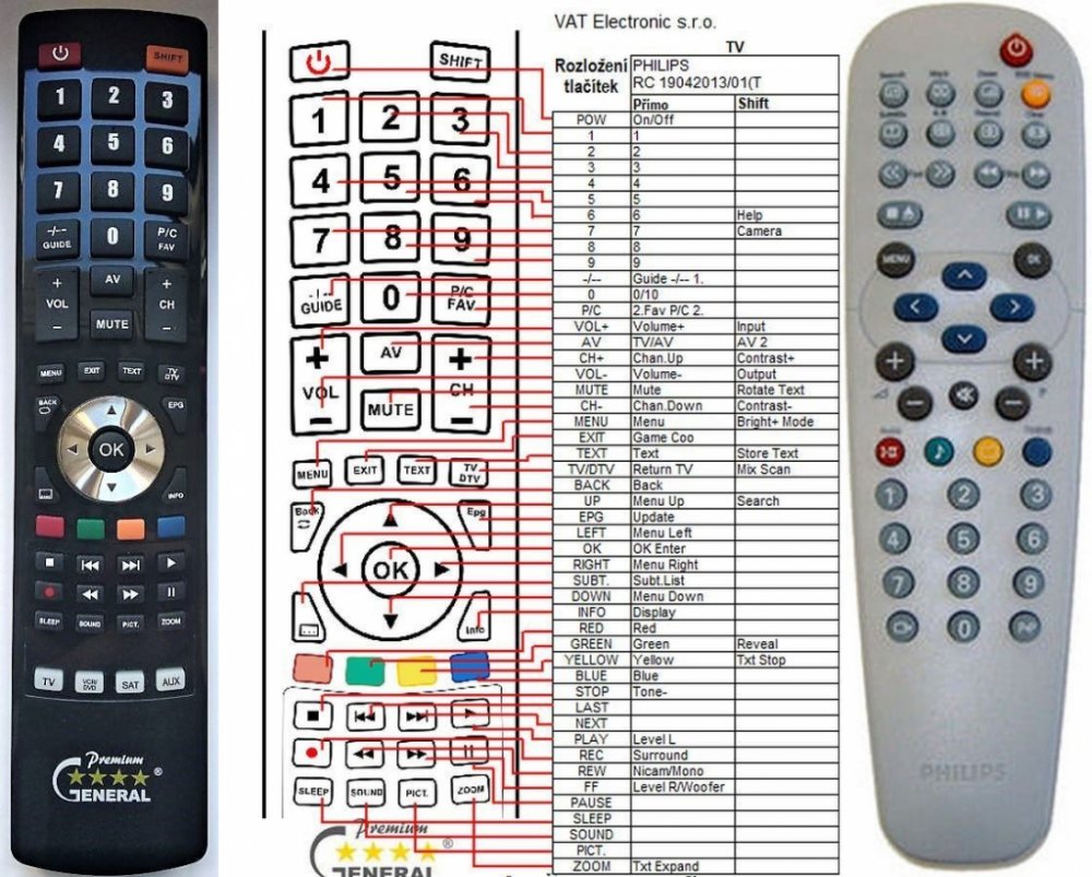 Náhradní dálkový ovladač PHILIPS RC19042013, RCLE016 - 100% náhrada 1:1 za originální dálkový ovladač. Dálkový ovladač byl vyvinut speciálně na míru pro tyto modely značky PHILIPS:14PT6107/01B, 14PT6107/05L, 15PT6807/01. (Nemusí zde být uvedeny úplně všechny kompatibilní modely. Pokud si nejste jisti, sdělte nám svůj model (použijte online chat, e-mail, telefon), neprodleně zkontrolujeme a ověříme, zda je tento ovladač kompatibilní s Vaším přístrojem. Za poskytnutou informaci ručíme.) Ovladač je dodáván ve verzi značkového dálkového ovladače General Premium (zobrazen vlevo). Garantujeme Vám, že dostanete ovladač, který plně nahradí Váš původní originální ovladač a bude mít naprosto všechny funkce stejné.Není to univerzální ovladač, ale ovladač, který je naprogramován a přímo určen pro modely přístrojů uvedené výše. Není třeba žádné párování, žádné kódy. Obdržíte od nás ovladač, který je připraven k použití - jediné, co musíte udělat, je vložit baterie a ovladač hned funguje. Podívejte se na obrázek ovladače a ujistěte se, že jsou v tabulce všechny funkce jako na původním originálním ovladači. Jedná se o plnohodnotný náhradní dálkový ovladač (není to „univerzál“). Má naprosto všechny funkce přesně jako originální ovladač. Záruční lhůta na ovladač je 3 roky. Dodáván také jednoduchý návod s mapováním funkcí. DOPLŇKOVÁ FUNKCE: Tento dálkový ovladač je možno naprogramovat na 1-4 zařízení (celkem tedy 4). Budete moci jedním ovladačem ovládat několik různých přístrojů jedním ovladačem. Pokud nám do komentáře v objednávce napíšete modely dalších přístrojů, naprogramujeme Vám ovladač na všechny. Za tuto doplňkovou službu bude naúčtován příplatek k ceně ovladače 50 Kč: více informacíV případě, že v budoucnu vyměníte/obměníte Vaši domácí elektroniku, jsme schopni Vám tento ovladač přeprogramovat na naprosto jakékoliv nové/á zařízení. Ovladač General přežije Váš stávající přístroj!