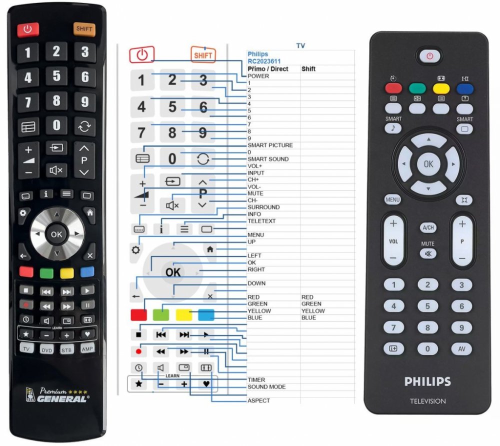 Náhradní dálkový ovladač PHILIPS RC2023611, 996500045165 - 100procent náhrada 1:1 za originální dálkový ovladač. Dálkový ovladač je určen pro tyto modely PHILIPS: 15PFL4122, 15PFL4122/10, 19PFL4322, 19PFL4322/10, 20PFL4122, 20PFL4122/10. (Nemusí zde být uvedeny úplně všechny kompatibilní modely. Pokud si nejste jisti, sdělte nám svůj model (použijte online chat, e-mail, telefon), neprodleně zkontrolujeme a ověříme, zda je tento ovladač kompatibilní s Vaším přístrojem. Za poskytnutou informaci ručíme.) Ovladač je dodáván ve verzi značkového dálkového ovladače General Premium (zobrazen vlevo). Garantujeme Vám, že dostanete ovladač, který plně nahradí Váš původní originální ovladač a bude mít naprosto všechny funkce. Není to univerzální ovladač, ale ovladač, který je naprogramován a přímo určen pro modely přístrojů uvedené výše. Není třeba žádné párování, žádné kódy. Obdržíte od nás ovladač, který je připraven k použití - jediné, co musíte udělat, je vložit baterie a ovladač hned funguje. Podívejte se na obrázek ovladače a ujistěte se, že jsou v tabulce všechny funkce jako na původním originálním ovladači. Jedná se o plnohodnotný náhradní dálkový ovladač (není to „univerzál“). Má naprosto všechny funkce přesně jako originální ovladač. Záruční lhůta na ovladač je 2 roky. Dodáván také jednoduchý návod s mapováním funkcí. DOPLŇKOVÁ FUNKCE: Tento dálkový ovladač je možno naprogramovat na 1-4 zařízení (celkem tedy 4). Budete moci jedním ovladačem ovládat několik různých přístrojů jedním ovladačem. Pokud nám do komentáře v objednávce napíšete modely dalších přístrojů, naprogramujeme Vám ovladač na všechny. Za tuto doplňkovou službu bude naúčtován příplatek k ceně ovladače 50 Kč: více informací V případě, že v budoucnu vyměníte/obměníte Vaši domácí elektroniku, jsme schopni Vám tento ovladač přeprogramovat na naprosto jakékoliv nové/á zařízení. Ovladač General přežije Váš stávající přístroj!