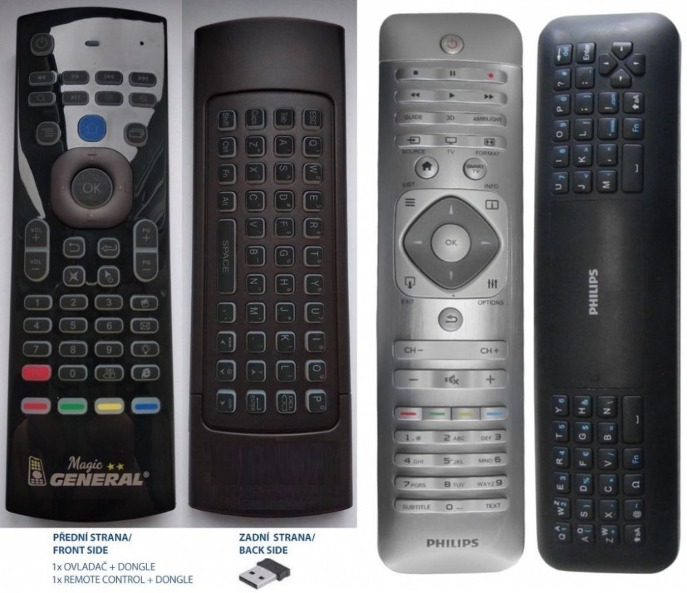PLNOHODNOTNÁ náhrada magického dálkového ovladače PHILIPS YKF319-007, 242254990642 (YKF319007, 242254990642) s integrovanou klávesnicí a možností nastavení na další přístroje.Dokonalá 1:1 kopie navržená a vyrobená naší firmou – má všechny funkce originálního ovladače pro tyto modely značky PHILIPS:40PFL8008S/12, 42PFL6678K/12, 42PFL7008K/12, 46PFL8007K/12, 46PFL8008S/12, 47PFL6678K/12, 47PFL7008K/12, 50PFL8008S/12, 55PFL7008K/12, 55PFL8008S/12. (Nemusí zde být uvedeny úplně všechny kompatibilní modely. Pokud si nejste jisti, sdělte nám svůj model (použijte online chat, e-mail, telefon), neprodleně zkontrolujeme a ověříme, zda je tento ovladač kompatibilní s Vaším přístrojem. Za poskytnutou informaci ručíme.) Náhradní Ovladač je dodáván ve verzi luxusního multifunkčního air mouse ovladače s integrovanou klávesnicí General MAGIC (zobrazen vlevo). Ovladač dostanete již nakonfigurovaný na výše uvedené modely. Nevyžaduje žádné nastavování ani kódy.FUNKCE:2,4G rádiová technologie ovládání pohybem pomocí Gyroskopu (tzv. létající myš), RF bezdrátová klávesnice + IR dálkové ovládání s funkcí učení (3v1).SNADNÁ INSTALACE - PLUG & PLAY: Zasuňte USB adaptér do televizoru, počkejte několik sekund, dokud se na displeji neobjeví šipka a můžete hned začít používat. USB adaptér je součástí a je již spárován. Není třeba žádné další párování. Nevyžaduje od Vás žádné nastavování, ovladač Vám přijde již námi nakonfigurovaný na Vaši SMART TV. Vybalíte, vložíte baterie a ovládáte! Ale přesto nepřicházíte o možnost si nastavení ovladače General Magic sami upravovat podle Vašich potřeb (pokud se třeba budete u sledování TV nudit :-) General MAGIC se umí učit kódy z jakéhokoliv jiného IR ovladače DVD, HIFI, BLUE-RAY, AVR atd. Můžete si na ho naučit tak, že bude umět ovládat nejen Váš smart televizor, ale také všechny ostatní Vaše přístroje. Ovládání všeho jedním ovladače General SMART bude velmi snadné. General MAGIC funguje jako létající myš. Pomocí integrovaného gyroskopu umožňuje snadné ovládá..