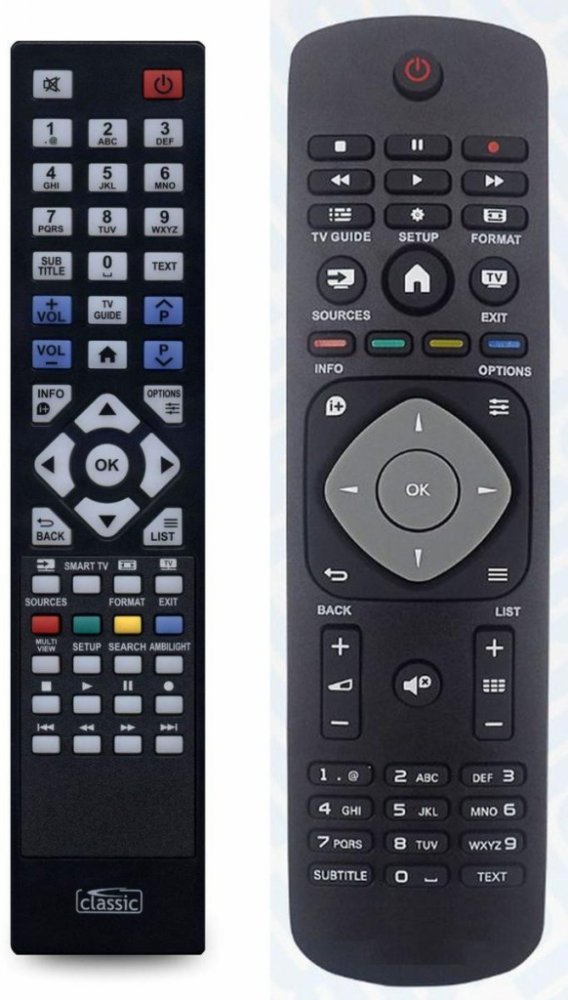 Náhradní dálkový ovladač PHILIPS YKF346-001, 996590009359 (YKF346001, 996590009359). Dálkový ovladač je určen pro tyto modely PHILIPS: 20PHH4109, 20PHH4109/88, 22PFH4000, 22PFH4109, 22PFH4109/88, 22PFK4000, 22PFK4109, 22PFK4209, 22PFS4031, 22PFS4232, 22PFT4000, 22PFT4109, 23PHH4009, 23PHH4109, 23PHK4009, 23PHT4009, 24PFS5505/12, 24PHH4000, 24PHH4109, 24PHH4109/88, 24PHK4000, 24PHK4109, 24PHS4304, 24PHT4000, 24PHT4109, 24PHT5210/12, 28PHH4109, 28PHH4109/88, 32PFH4100, 32PFH4109, 32PFH4309, 32PFH4399, 32PFK4100, 32PFK4109, 32PFK4309, 32PFK5109, 32PFS4132, 32PFT4100, 32PFT4131, 32PFT4131/12, 32PFT4309, 32PHH4100, 32PHH4109, 32PHH4200, 32PHH4201/88, 32PHH4309, 32PHH4319, 32PHH4329, 32PHK4100, 32PHK4109, 32PHK4309, 32PHS4132/12, 32PHS4203/12, 32PHS4504, 32PHT4100, 32PHT4101/12, 32PHT4109, 32PHT4200, 32PHT4203/12, 32PHT4309, 32PHT4319, 39PFH4100, 40PFH4009, 40PFH4100, 40PFH4101/88, 40PFH4109, 40PFH4200, 40PFH4309, 40PFH4319, 40PFH4329, 40PFH4399, 40PFK4009, 40PFK4100, 40PFK4200, 40PFK4309, 40PFK5109, 40PFT4009, 40PFT4100, 40PFT4101/12, 40PFT4109, 40PFT4200, 40PFT4309, 40PFT4319, 42PHH4201/88, 43PF5505/12, 43PFS5505/12, 43PFT4131/12, 43PFT4203, 43PUT4900, 47PFH4109, 47PFK4109, 47PFT4109, 48PFH4100, 48PFK4100, 48PFK5109, 48PFT4100, 49PUT4900/12, 50PFH4009, 50PFH4109, 50PFH4309, 50PFH4319, 50PFH4329, 50PFK4009, 50PFK4109, 50PFK4309, 50PFS4012/12, 50PFT4009, 50PFT4109, 50PFT4309, 50PFT4319, 50PSF4012/12, 55PFK5109, H4000, H4009, H4109, H4309, H4319, H4329, H4399, K4000, K4109, K4209, K4309, K5109, Q552.ELA, T4000, T4009, T4109, T4309, T4319. (Nemusí zde být uvedeny úplně všechny kompatibilní modely. Pokud si nejste jisti, sdělte nám svůj model (použijte online chat, e-mail, telefon), neprodleně zkontrolujeme a ověříme, zda je tento ovladač kompatibilní s Vaším přístrojem. Za poskytnutou informaci ručíme.) Classic IRC87235 Ovladač je dodáván ve verzi značkového dálkového ovladače Classic (zobrazen vlevo) Toto dálkové ovládání nemusíte nijak párovat s přístrojem, nevyžaduje žádné nastavování, žádné kódy. Stačí vložit baterie a okamžitě funguje se všemi výše uvedenými modely. Tento náhradní dálkový ovladač má naprosto stejné funkce jako Váš původní dálkový ovladač a používá se stejným způsobem. Má stejné názvy a rozložení tlačítek jako původní dálkový ovladač. Záruka vysoké kvality: Výrobce je německá společnost Classic. Dálkové ovládače značky Classic mají vynikající kvalitu a nulovou poruchovost. DUPLIKÁT originálního dálkového ovladače má naprosto stejné funkce a stejné názvy tlačítek jako Váš původní originální ovladač. Nemusíte nic nastavovat, po vložení baterií bude okamžitě fungovat, ovladač je již nakonfigurován tak, aby fungoval na modely uvedené níže. Nápisy na tlacitkach přesně odpovídají funkcím tlačítek, tiskneme je přesně podle oriignálního ovladače. Narozdil od všech univerzalnich a programovatelnych náhrad, kde jsou názvy tlačítek univerzální a pro uživatele matoucí. Popisky jsou natištěny technicky vyspělou technologií v naší provozovně (naše know-how), jsou extrémně odolné, nejdou setřít ani seškrábat (např.nehtem). Opravdu jsme schopni vyrobit jakýkoliv dálkový ovladač! Splníme i požadavky na exotické ovladače, které nejsou (zatím :) v naší nabídce. DUPLIKÁT = Nejlepší poměr cena/výkon. DOPORUČUJEME!