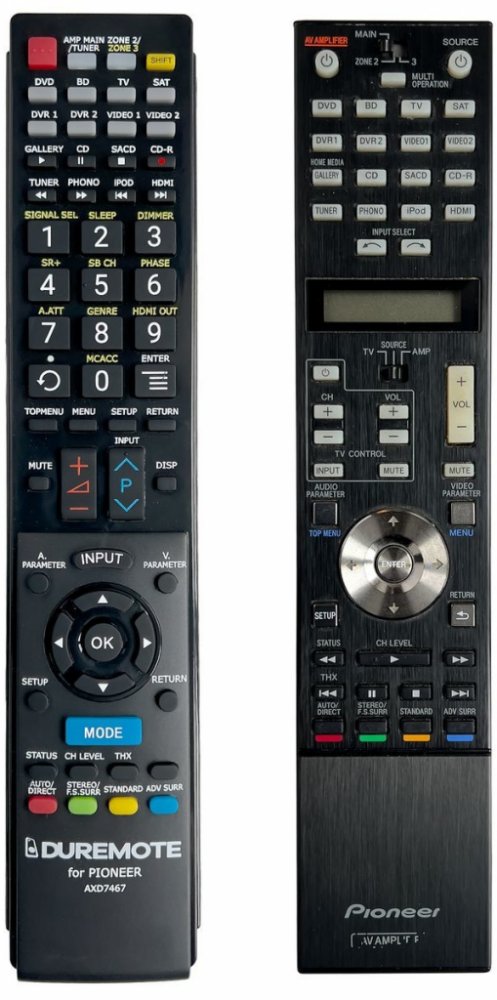 Dálkový ovladač PIONEER AXD7467 duplikát 1:1 originálního dálkového ovladače. Dokonalá 1:1 kopie navržená a vyrobená naší firmou – má všechny funkce originálního ovladače pro tyto modely značky PIONEER:SC-LX90, SCLX90. (Nemusí zde být uvedeny úplně všechny kompatibilní modely. Pokud si nejste jisti, sdělte nám svůj model (použijte online chat, e-mail, telefon), neprodleně zkontrolujeme a ověříme, zda je tento ovladač kompatibilní s Vaším přístrojem. Za poskytnutou informaci ručíme.) Dálkový ovladač General Duremote má naprosto všechny funkce a popisky tlačítek stejné jako originální dálkový ovladač. Není třeba nic nastavovat, žádné kódy, funguje ihned po vložení baterií se všemi výše uvedenými modely.Ovladač je dodáván ve verzi značkového dálkového ovladače General Duremote (zobrazen vlevo)Jedná se o ovladač vyrobený pro specifické zařízení – NENÍ to univerzální ovladač!Má naprosto všechny funkce jako originální dálkový ovladač.Má stejné popisky tlačítek, jako jste byli zvyklí z originálu.Popisky tlačítek jsou velmi odolné a nejdou seškrábat ani hrubou silou.3 roky záruka.Nulová poruchovost tohoto modelu! Nemáme zádné reklamace a přitom je to náš nejprodávanější ovladač.General Duremote byl tlačítko po tlačítku navržen a vyroben přesně podle originálního dálkového ovladače na obrázku vpravo. Výroben v naší firmě v Ostravě, vývoj, výroba i atesty v České republice - splňuje CE a ROHS standardy.SNADNÉ INTUITIVNÍ POUŽÍVÁNÍ: Na rozdíl od běžných náhradních ovladačů, General Duremote má 100% stejné popisky tlačítek jako Váš původní originální dálkový ovladač.Srovnání: Ostatní univerzální nebo programovatelné náhrady mají (kvůli úspoře nákladů) univerzální rozložení s nesprávně označenými tlačítky, a proto potřebují návod (tabulku funkcí), který říká, jaká je skutečná funkce jednotlivých tlačítek. To může způsobovat zmatek a nutnost neustálého vracení se k návodu je pro koncového uživatele obtěžující. Naopak při používání našeho dálkového ovladače General Duremote nahlížet do návodu vůbec nepotřebu..