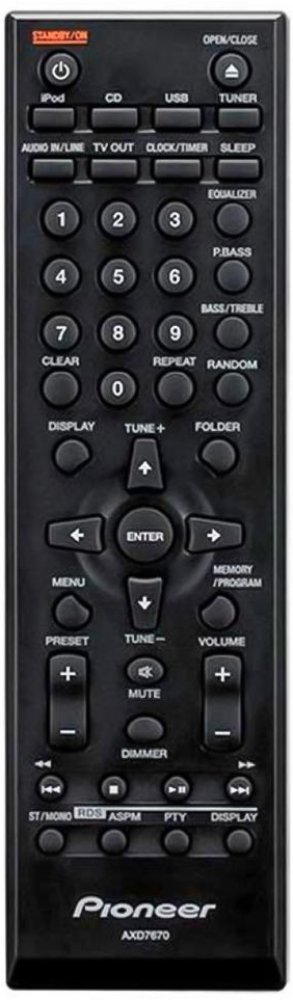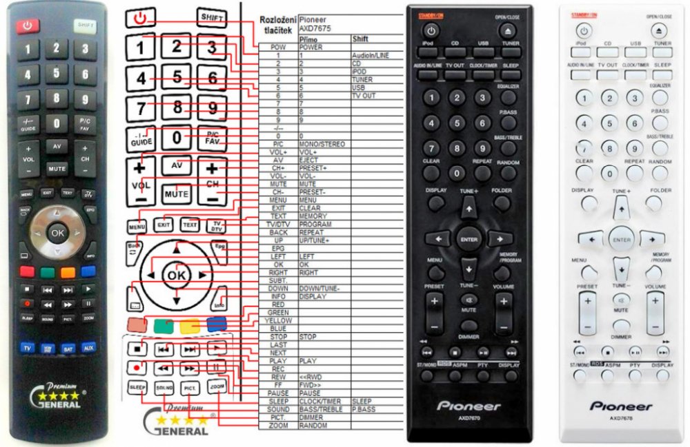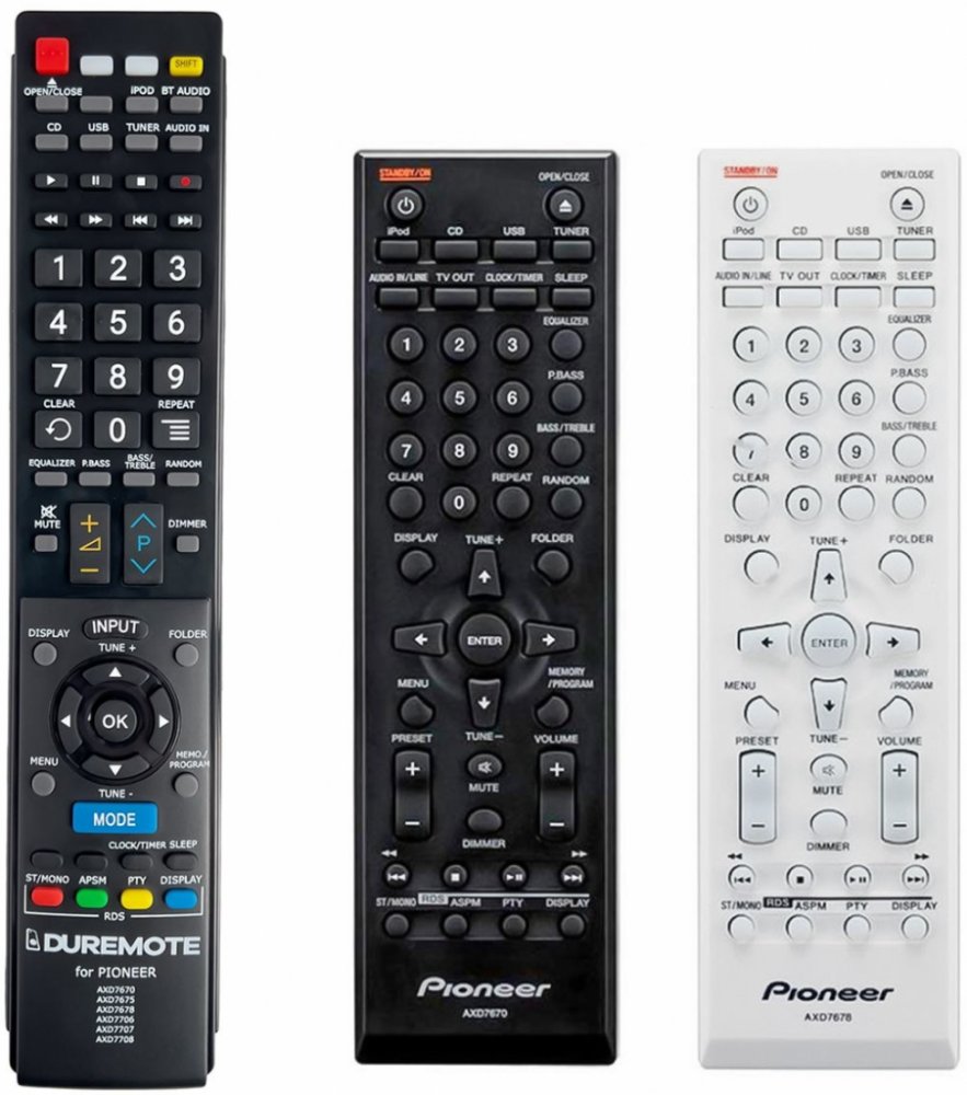 Dálkový ovladač PIONEER AXD7670, AXD7675, AXD7678 duplikát 1:1 originálního dálkového ovladače. Dokonalá 1:1 kopie navržená a vyrobená naší firmou – má všechny funkce originálního ovladače pro tyto modely značky PIONEER:AXD7670, X-CM31, X-CM31-K, X-CM31-R, X-CM31-T, X-CM31-W, X-CM32. (Nemusí zde být uvedeny úplně všechny kompatibilní modely. Pokud si nejste jisti, sdělte nám svůj model (použijte online chat, e-mail, telefon), neprodleně zkontrolujeme a ověříme, zda je tento ovladač kompatibilní s Vaším přístrojem. Za poskytnutou informaci ručíme.) Dálkový ovladač General Duremote má naprosto všechny funkce a popisky tlačítek stejné jako originální dálkový ovladač. Není třeba nic nastavovat, žádné kódy, funguje ihned po vložení baterií se všemi výše uvedenými modely.Ovladač je dodáván ve verzi značkového dálkového ovladače General Duremote (zobrazen vlevo)Jedná se o ovladač vyrobený pro specifické zařízení – NENÍ to univerzální ovladač!Má naprosto všechny funkce jako originální dálkový ovladač.Má stejné popisky tlačítek, jako jste byli zvyklí z originálu.Popisky tlačítek jsou velmi odolné a nejdou seškrábat ani hrubou silou.3 roky záruka.Nulová poruchovost tohoto modelu! Nemáme zádné reklamace a přitom je to náš nejprodávanější ovladač.General Duremote byl tlačítko po tlačítku navržen a vyroben přesně podle originálního dálkového ovladače na obrázku vpravo. Výroben v naší firmě v Ostravě, vývoj, výroba i atesty v České republice - splňuje CE a ROHS standardy.SNADNÉ INTUITIVNÍ POUŽÍVÁNÍ: Na rozdíl od běžných náhradních ovladačů, General Duremote má 100% stejné popisky tlačítek jako Váš původní originální dálkový ovladač.Srovnání: Ostatní univerzální nebo programovatelné náhrady mají (kvůli úspoře nákladů) univerzální rozložení s nesprávně označenými tlačítky, a proto potřebují návod (tabulku funkcí), který říká, jaká je skutečná funkce jednotlivých tlačítek. To může způsobovat zmatek a nutnost neustálého vracení se k návodu je pro koncového uživatele obtěžující. Naopak při používání našeho dálk..