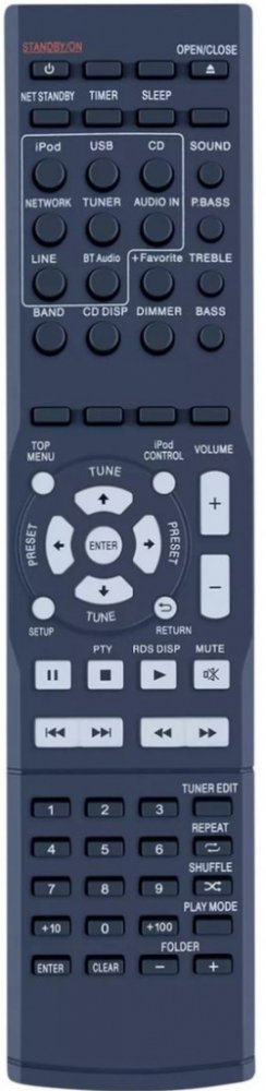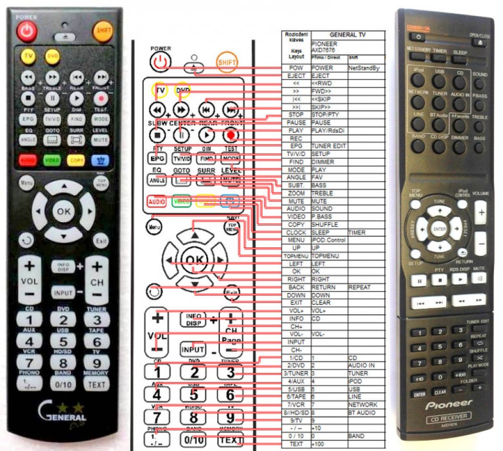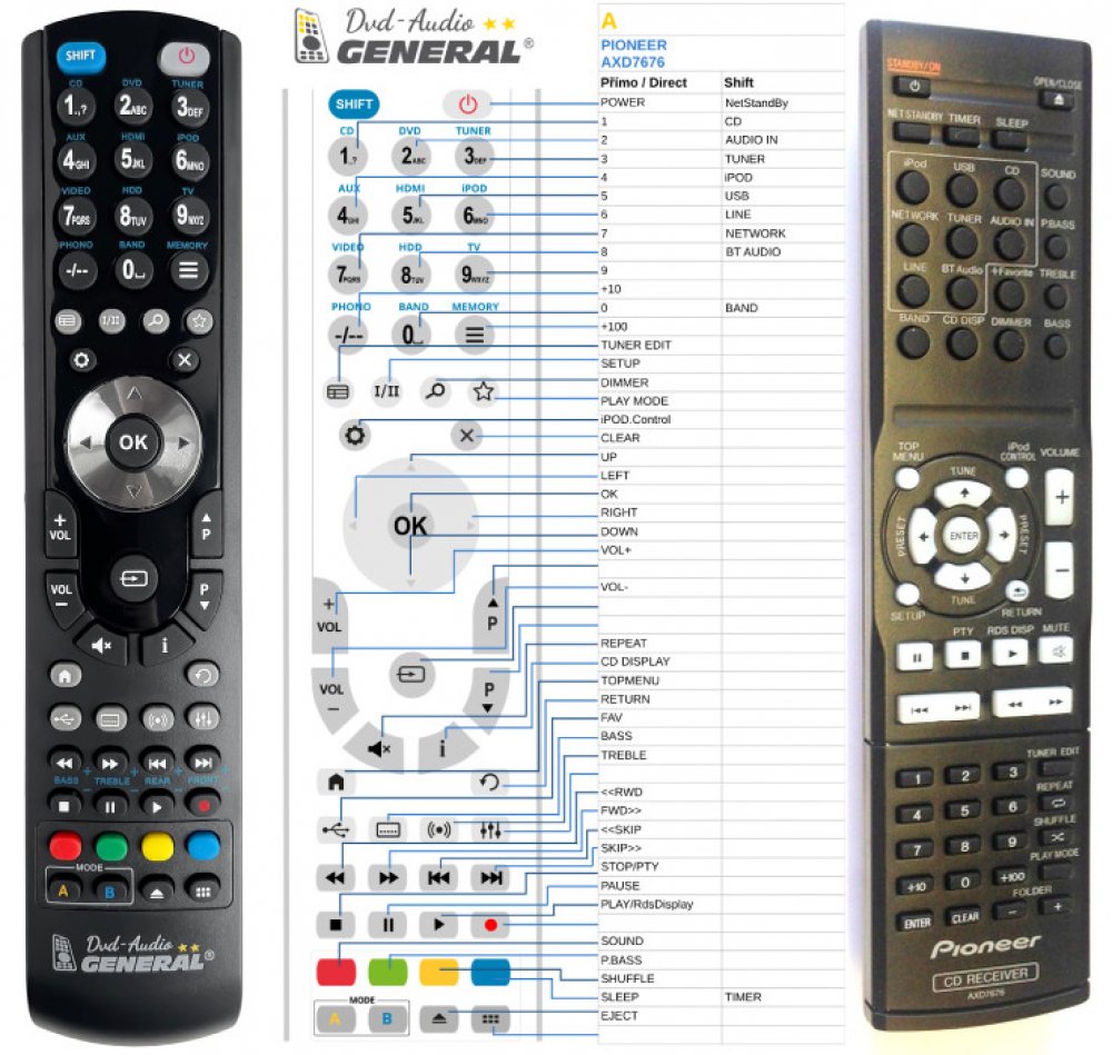 Náhradní dálkový ovladač PIONEER AXD7676 - 100procent náhrada 1:1 za originální dálkový ovladač. Dálkový ovladač je určen pro tyto modely PIONEER: X-HM71-K, X-HM71-S, X-HM81-K, X-HM81-S, XC-HM81-K, XC-HM81-S. (Nemusí zde být uvedeny úplně všechny kompatibilní modely. Pokud si nejste jisti, sdělte nám svůj model (použijte online chat, e-mail, telefon), neprodleně zkontrolujeme a ověříme, zda je tento ovladač kompatibilní s Vaším přístrojem. Za poskytnutou informaci ručíme.) Ovladač je dodáván ve verzi značkového dálkového ovladače General DVD/AUDIO (zobrazen vlevo). Garantujeme Vám, že dostanete ovladač, který plně nahradí Váš původní originální ovladač a bude mít naprosto všechny funkce. Není to univerzální ovladač, ale ovladač, který je naprogramován a přímo určen pro modely přístrojů uvedené výše. Není třeba žádné párování, žádné kódy. Obdržíte od nás ovladač, který je připraven k použití - jediné, co musíte udělat, je vložit baterie a ovladač hned funguje. Podívejte se na obrázek ovladače a ujistěte se, že jsou v tabulce všechny funkce jako na původním originálním ovladači. Jedná se o plnohodnotný náhradní dálkový ovladač (není to „univerzál“). Má naprosto všechny funkce přesně jako originální ovladač. Záruční lhůta na ovladač je 2 roky. Dodáván také jednoduchý návod s mapováním funkcí. DOPLŇKOVÁ FUNKCE: Tento dálkový ovladač je možno naprogramovat na 1 další přístroj. Budete moci jedním ovladačem ovládat oba přístroje (např. DVD plus TV nebo SOUNDBAR plus TV apod.). Pokud nám do komentáře v objednávce napíšete model dalšího přístroje, naprogramujeme Vám ovladač na oba. Za tuto doplňkovou službu bude naúčtován příplatek k ceně ovladače 50 Kč: více informací