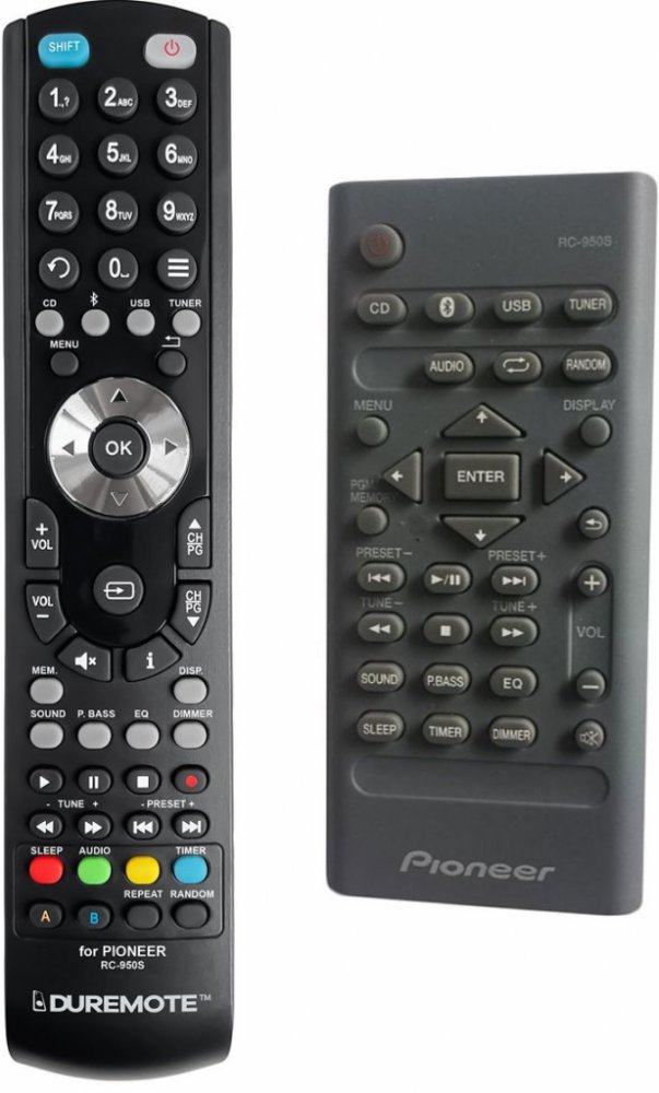 Náhradní dálkový ovladač PIONEER RC-950S (RC950S) - 100% náhrada 1:1 za originální dálkový ovladač. Dálkový ovladač byl vyvinut speciálně na míru pro tyto modely značky PIONEER:X-CM56, X-CM56D, X-HM26, X-SMC02, XCM56. (Nemusí zde být uvedeny úplně všechny kompatibilní modely. Pokud si nejste jisti, sdělte nám svůj model (použijte online chat, e-mail, telefon), neprodleně zkontrolujeme a ověříme, zda je tento ovladač kompatibilní s Vaším přístrojem. Za poskytnutou informaci ručíme.) Ovladač je dodáván ve verzi značkového dálkového ovladače General DVD/AUDIO (zobrazen vlevo). Garantujeme Vám, že dostanete ovladač, který plně nahradí Váš původní originální ovladač a bude mít naprosto všechny funkce stejné.Není to univerzální ovladač, ale ovladač, který je naprogramován a přímo určen pro modely přístrojů uvedené výše. Není třeba žádné párování, žádné kódy. Obdržíte od nás ovladač, který je připraven k použití - jediné, co musíte udělat, je vložit baterie a ovladač hned funguje. Podívejte se na obrázek ovladače a ujistěte se, že jsou v tabulce všechny funkce jako na původním originálním ovladači. Jedná se o plnohodnotný náhradní dálkový ovladač (není to „univerzál“). Má naprosto všechny funkce přesně jako originální ovladač. Záruční lhůta na ovladač je 3 roky. Dodáván také jednoduchý návod s mapováním funkcí. DOPLŇKOVÁ FUNKCE: Tento dálkový ovladač je možno naprogramovat na 1 další přístroj. Budete moci jedním ovladačem ovládat oba přístroje (např. DVD+TV nebo SOUNDBAR+TV apod.). Pokud nám do komentáře v objednávce napíšete model dalšího přístroje, naprogramujeme Vám ovladač na oba. Za tuto doplňkovou službu bude naúčtován příplatek k ceně ovladače 50 Kč: více informací