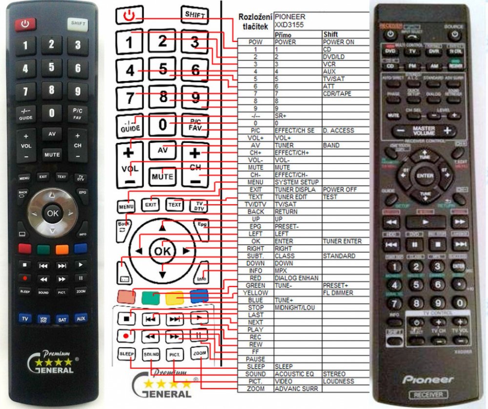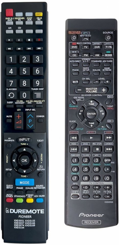 Dálkový ovladač PIONEER XXD3155 duplikát 1:1 originálního dálkového ovladače. Dokonalá 1:1 kopie navržená a vyrobená naší firmou – má všechny funkce originálního ovladače pro tyto modely značky PIONEER:VSX-518-K, VSX518K. (Nemusí zde být uvedeny úplně všechny kompatibilní modely. Pokud si nejste jisti, sdělte nám svůj model (použijte online chat, e-mail, telefon), neprodleně zkontrolujeme a ověříme, zda je tento ovladač kompatibilní s Vaším přístrojem. Za poskytnutou informaci ručíme.) Dálkový ovladač General Duremote má naprosto všechny funkce a popisky tlačítek stejné jako originální dálkový ovladač. Není třeba nic nastavovat, žádné kódy, funguje ihned po vložení baterií se všemi výše uvedenými modely.Ovladač je dodáván ve verzi značkového dálkového ovladače General Duremote (zobrazen vlevo)Jedná se o ovladač vyrobený pro specifické zařízení – NENÍ to univerzální ovladač!Má naprosto všechny funkce jako originální dálkový ovladač.Má stejné popisky tlačítek, jako jste byli zvyklí z originálu.Popisky tlačítek jsou velmi odolné a nejdou seškrábat ani hrubou silou.3 roky záruka.Nulová poruchovost tohoto modelu! Nemáme zádné reklamace a přitom je to náš nejprodávanější ovladač.General Duremote byl tlačítko po tlačítku navržen a vyroben přesně podle originálního dálkového ovladače na obrázku vpravo. Výroben v naší firmě v Ostravě, vývoj, výroba i atesty v České republice - splňuje CE a ROHS standardy.SNADNÉ INTUITIVNÍ POUŽÍVÁNÍ: Na rozdíl od běžných náhradních ovladačů, General Duremote má 100% stejné popisky tlačítek jako Váš původní originální dálkový ovladač.Srovnání: Ostatní univerzální nebo programovatelné náhrady mají (kvůli úspoře nákladů) univerzální rozložení s nesprávně označenými tlačítky, a proto potřebují návod (tabulku funkcí), který říká, jaká je skutečná funkce jednotlivých tlačítek. To může způsobovat zmatek a nutnost neustálého vracení se k návodu je pro koncového uživatele obtěžující. Naopak při používání našeho dálkového ovladače General Duremote nahlížet do návodu vůbec nepotř..