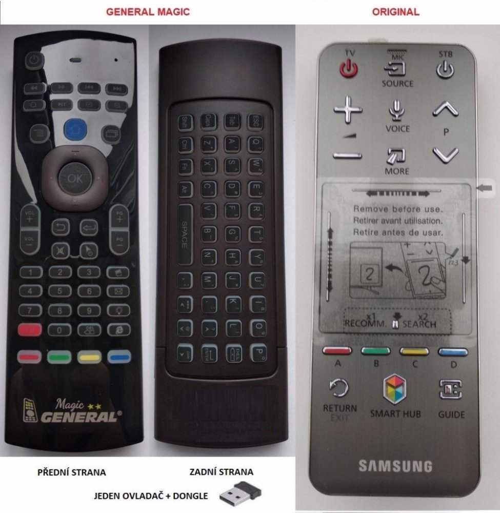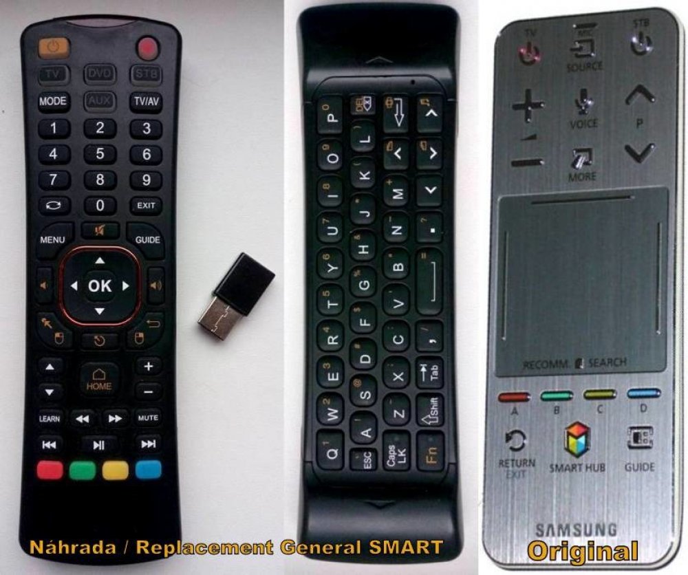 PLNOHODNOTNÁ náhrada magického dálkového ovladače SAMSUNG AA59-00759A (AA5900759A) s integrovanou klávesnicí a možností nastavení na další přístroje.Dálkový ovladač je určen pro tyto modely SAMSUNG:PS51F8590SL, PS64F8500SL, PS64F8590SL, UA55F8000AM, UE40F6740SB, UE40F6740SS, UE40F6750SS, UE40F6770SS, UE40F7000SL, UE40F7000ST, UE40F7000SZ, UE40F7080ST, UE40F7090SL, UE40F8000AT, UE40F8000SL, UE40F8000ST, UE40F8000SZ, UE40F8005ST, UE40F8090SL, UE46F6740SB, UE46F6740SS, UE46F6750SB, UE46F6750SS, UE46F6770SB, UE46F6770SS, UE46F7000AT, UE46F7000SL, UE46F7000ST, UE46F7000SZ, UE46F7005ST, UE46F7090SL, UE46F8000AT, UE46F8000SL, UE46F8000ST, UE46F8000SZ, UE46F8005ST, UE46F8080ST, UE46F8090SL, UE46F8500ST, UE55F6740SB, UE55F6740SS, UE55F6750SBXXH, UE55F6750SS, UE55F6755SB, UE55F6770SS, UE55F7000SL, UE55F7000ST, UE55F7000SZ, UE55F7005ST, UE55F7090SL, UE55F8000SL, UE55F8000ST, UE55F8000SZ, UE55F8005ST, UE55F8080ST, UE55F8090SL, UE55F8500ST, UE60F7000SL, UE60F7000SLXXH, UE65F8000ST, UE75F8000ST. (Nemusí zde být uvedeny úplně všechny kompatibilní modely. Pokud si nejste jisti, sdělte nám svůj model (použijte online chat, e-mail, telefon), neprodleně zkontrolujeme a ověříme, zda je tento ovladač kompatibilní s Vaším přístrojem. Za poskytnutou informaci ručíme.) Náhradní Ovladač je dodáván ve verzi luxusního multifunkčního air mouse ovladače s integrovanou klávesnicí General MAGIC (zobrazen vlevo). Ovladač dostanete již nakonfigurovaný na výše uvedené modely. Nevyžaduje žádné nastavování ani kódy.FUNKCE:2,4G rádiová technologie ovládání pohybem pomocí Gyroskopu (tzv. létající myš), RF bezdrátová klávesnice + IR dálkové ovládání s funkcí učení (3v1).SNADNÁ INSTALACE - PLUG & PLAY: Zasuňte USB adaptér do televizoru, počkejte několik sekund, dokud se na displeji neobjeví šipka a můžete hned začít používat. USB adaptér je součástí a je již spárován. Není třeba žádné další párování. Nevyžaduje od Vás žádné nastavování, ovladač Vám přijde již námi nakonfigurovaný na Vaši SMART TV. Vybalíte, vložíte..