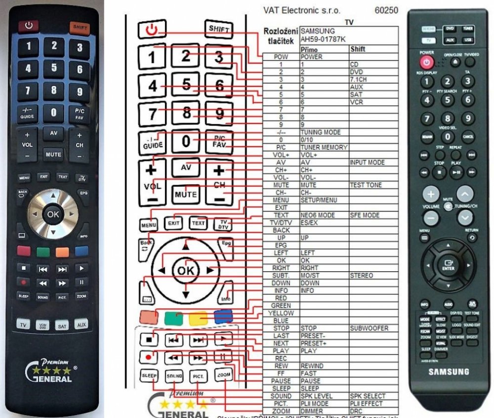 Náhradní dálkový ovladač SAMSUNG AH59-01787N (AH5901787N) - 100procent náhrada 1:1 za originální dálkový ovladač. Dálkový ovladač je určen pro tyto modely SAMSUNG: HT-TX22R/XEF, HT-TX22R/XEF., HT-X20R/NWT, HT-X20R/SKD, HT-X20R/XEE, HT-X20R/XEF, HT-X20R/XEO, HT-X20R/XET. (Nemusí zde být uvedeny úplně všechny kompatibilní modely. Pokud si nejste jisti, sdělte nám svůj model (použijte online chat, e-mail, telefon), neprodleně zkontrolujeme a ověříme, zda je tento ovladač kompatibilní s Vaším přístrojem. Za poskytnutou informaci ručíme.) Ovladač je dodáván ve verzi značkového dálkového ovladače General Premium (zobrazen vlevo). Garantujeme Vám, že dostanete ovladač, který plně nahradí Váš původní originální ovladač a bude mít naprosto všechny funkce. Není to univerzální ovladač, ale ovladač, který je naprogramován a přímo určen pro modely přístrojů uvedené výše. Není třeba žádné párování, žádné kódy. Obdržíte od nás ovladač, který je připraven k použití - jediné, co musíte udělat, je vložit baterie a ovladač hned funguje. Podívejte se na obrázek ovladače a ujistěte se, že jsou v tabulce všechny funkce jako na původním originálním ovladači. Jedná se o plnohodnotný náhradní dálkový ovladač (není to „univerzál“). Má naprosto všechny funkce přesně jako originální ovladač. Záruční lhůta na ovladač je 2 roky. Dodáván také jednoduchý návod s mapováním funkcí. DOPLŇKOVÁ FUNKCE: Tento dálkový ovladač je možno naprogramovat na 1-4 zařízení (celkem tedy 4). Budete moci jedním ovladačem ovládat několik různých přístrojů jedním ovladačem. Pokud nám do komentáře v objednávce napíšete modely dalších přístrojů, naprogramujeme Vám ovladač na všechny. Za tuto doplňkovou službu bude naúčtován příplatek k ceně ovladače 50 Kč: více informací V případě, že v budoucnu vyměníte/obměníte Vaši domácí elektroniku, jsme schopni Vám tento ovladač přeprogramovat na naprosto jakékoliv nové/á zařízení. Ovladač General přežije Váš stávající přístroj!