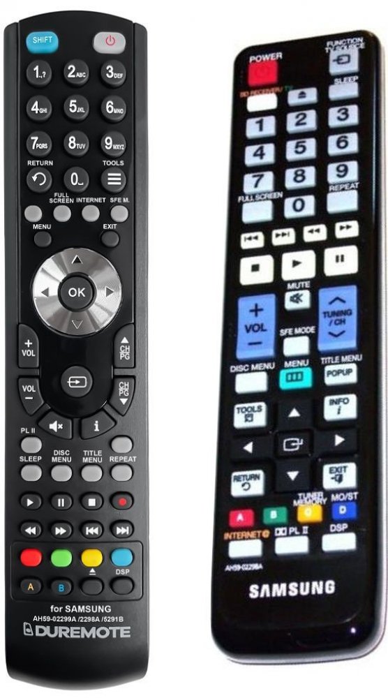 Dálkový ovladač SAMSUNG AH59-02298A, AH64-05291B, HTC5500, HTC5530, HTC5550, HTC6500 (AH5902298A, AH6405291B, HTC5500, HTC5530, HTC5550, HTC6500) duplikát 1:1 originálního dálkového ovladače. Dokonalá 1:1 kopie navržená a vyrobená naší firmou – má všechny funkce originálního ovladače pro tyto modely značky SAMSUNG:HT-C5530, HT-C5900, HT-C5950W, HT-C6000, HT-C6930W. (Nemusí zde být uvedeny úplně všechny kompatibilní modely. Pokud si nejste jisti, sdělte nám svůj model (použijte online chat, e-mail, telefon), neprodleně zkontrolujeme a ověříme, zda je tento ovladač kompatibilní s Vaším přístrojem. Za poskytnutou informaci ručíme.) Dálkový ovladač General Duremote má naprosto všechny funkce a popisky tlačítek stejné jako originální dálkový ovladač. Není třeba nic nastavovat, žádné kódy, funguje ihned po vložení baterií se všemi výše uvedenými modely.Ovladač je dodáván ve verzi značkového dálkového ovladače General Duremote (zobrazen vlevo)Jedná se o ovladač vyrobený pro specifické zařízení – NENÍ to univerzální ovladač!Má naprosto všechny funkce jako originální dálkový ovladač.Má stejné popisky tlačítek, jako jste byli zvyklí z originálu.Popisky tlačítek jsou velmi odolné a nejdou seškrábat ani hrubou silou.3 roky záruka.Nulová poruchovost tohoto modelu! Nemáme zádné reklamace a přitom je to náš nejprodávanější ovladač.General Duremote byl tlačítko po tlačítku navržen a vyroben přesně podle originálního dálkového ovladače na obrázku vpravo. Výroben v naší firmě v Ostravě, vývoj, výroba i atesty v České republice - splňuje CE a ROHS standardy.SNADNÉ INTUITIVNÍ POUŽÍVÁNÍ: Na rozdíl od běžných náhradních ovladačů, General Duremote má 100% stejné popisky tlačítek jako Váš původní originální dálkový ovladač.Srovnání: Ostatní univerzální nebo programovatelné náhrady mají (kvůli úspoře nákladů) univerzální rozložení s nesprávně označenými tlačítky, a proto potřebují návod (tabulku funkcí), který říká, jaká je skutečná funkce jednotlivých tlačítek. To může způsobovat zmatek a nutnost neustálého ..