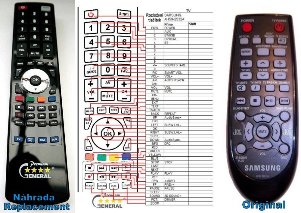 Náhradní dálkový ovladač SAMSUNG AH59-02532A (AH5902532A) - 100% náhrada 1:1 za originální dálkový ovladač. Dálkový ovladač byl vyvinut speciálně na míru pro tyto modely značky SAMSUNG:HW-F355, HW-F355/ZA, HWF355. (Nemusí zde být uvedeny úplně všechny kompatibilní modely. Pokud si nejste jisti, sdělte nám svůj model (použijte online chat, e-mail, telefon), neprodleně zkontrolujeme a ověříme, zda je tento ovladač kompatibilní s Vaším přístrojem. Za poskytnutou informaci ručíme.) Ovladač je dodáván ve verzi značkového dálkového ovladače General Premium (zobrazen vlevo). Garantujeme Vám, že dostanete ovladač, který plně nahradí Váš původní originální ovladač a bude mít naprosto všechny funkce stejné.Není to univerzální ovladač, ale ovladač, který je naprogramován a přímo určen pro modely přístrojů uvedené výše. Není třeba žádné párování, žádné kódy. Obdržíte od nás ovladač, který je připraven k použití - jediné, co musíte udělat, je vložit baterie a ovladač hned funguje. Podívejte se na obrázek ovladače a ujistěte se, že jsou v tabulce všechny funkce jako na původním originálním ovladači. Jedná se o plnohodnotný náhradní dálkový ovladač (není to „univerzál“). Má naprosto všechny funkce přesně jako originální ovladač. Záruční lhůta na ovladač je 3 roky. Dodáván také jednoduchý návod s mapováním funkcí. DOPLŇKOVÁ FUNKCE: Tento dálkový ovladač je možno naprogramovat na 1-4 zařízení (celkem tedy 4). Budete moci jedním ovladačem ovládat několik různých přístrojů jedním ovladačem. Pokud nám do komentáře v objednávce napíšete modely dalších přístrojů, naprogramujeme Vám ovladač na všechny. Za tuto doplňkovou službu bude naúčtován příplatek k ceně ovladače 50 Kč: více informacíV případě, že v budoucnu vyměníte/obměníte Vaši domácí elektroniku, jsme schopni Vám tento ovladač přeprogramovat na naprosto jakékoliv nové/á zařízení. Ovladač General přežije Váš stávající přístroj!