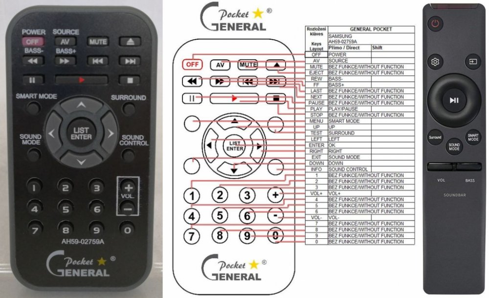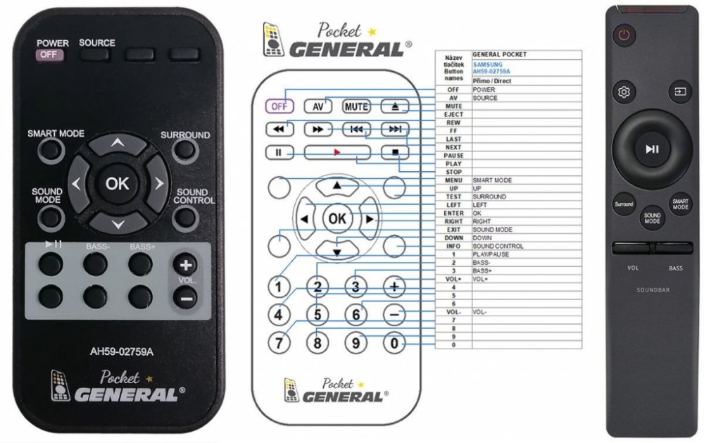Dálkový ovladač SAMSUNG AH59-02759A (AH5902759A) duplikát 1:1 originálního dálkového ovladače. Dálkový ovladač je určen pro tyto modely SAMSUNG: HM-MS650, HMMS650, HW-MS550, HW-MS551, HW-MS650, HW-MS6500, HW-MS6501, HW-MS651, HW-MS750, HW-MS751, HWMS550, HWMS551, HWMS650, HWMS6500, HWMS6501, HWMS651, HWMS750, HWMS751. (Nemusí zde být uvedeny úplně všechny kompatibilní modely. Pokud si nejste jisti, sdělte nám svůj model (použijte online chat, e-mail, telefon), neprodleně zkontrolujeme a ověříme, zda je tento ovladač kompatibilní s Vaším přístrojem. Za poskytnutou informaci ručíme.) Dálkový ovladač General POCKET duplikát má naprosto všechny funkce a popisky tlačítek stejné jako originální dálkový ovladač. Není třeba nic nastavovat, žádné kódy, funguje ihned po vložení baterií se všemi výše uvedenými modely. Ovladač je dodáván ve verzi značkového dálkového ovladače General POCKET duplikát (zobrazen vlevo) Jedná se o ovladač vyrobený pro specifické zařízení – NENÍ to univerzální ovladač! Má naprosto všechny funkce jako originální dálkový ovladač. Má stejné popisky tlačítek, jako jste byli zvyklí z originálu. Popisky tlačítek jsou velmi odolné a nejdou seškrábat ani hrubou silou. 2 roky záruka. General POCKET duplikát byl navržen a vyroben přesně podle originálního dálkového ovladače tlačítko po tlačítku. Ovladač je vyvinut a testován v České republice a podléhá CE a ROHS standardům. SNADNÉ INTUITIVNÍ POUŽÍVÁNÍ: Na rozdíl od běžných náhradních ovladačů, General POCKET duplikát má 100procent odpovídající popisky tlačítek jako na originálním ovladači. Srovnání: Jiné univerzální nebo programovatelné náhrady mají kvůli snížení nákladů názvy/popisky a rozložení tlačítek univerzální, popisky tlačítek často neodpovídají funkci tlačítka a vyžadují tedy návody k použití. To často vede k nejasnostem, co které tlačítko dělá a stálá potřeba manuálu je velmi obtěžující. S ovladačem General POCKET duplikát žádný návod nepotřebujete, tlačítko dělá přesně to, co symbolizuje jeho popisek. GARANTUJEME 100procent FUNKČNOST: Narozdíl od jiných náhrad je každý dálkový ovladač General POCKET duplikát přímo v naší firmě navržen a testován na míru pro konkrétní zařízení tak, aby každé tlačítko odpovídalo funkci tlačítka originálního ovladače. Díky tomu můžeme zaručit 100procent funkčnost přesně jako originální ovladač. Samotné šasi bylo navrženo a vyvíjeno tak, aby bylo co nejodolnější a nejspolehlivější. Zároveň však byl kladen důraz na přívětivé rozložení tlačítek a popisky tlačítek jsou optimalizovány pro dobrou viditelnost. Materiály a součástky byly podrobeny důkladným testům, aby odolaly i tomu nejtvrdšímu zacházení a poskytovaly tak dlouhodobou životnost. Názvy tlačítek jsou na ovladači natištěny moderní technologií v naší firmě (naše vlastní know-how). Tisk je extrémně odolný a nelze jej setřít ani oškrábat. DUPLIKÁT originálního dálkového ovladače má naprosto stejné funkce a stejné názvy tlačítek jako Váš původní originální ovladač. Nemusíte nic nastavovat, po vložení baterií bude okamžitě fungovat, ovladač je již nakonfigurován tak, aby fungoval na modely uvedené výše. Nápisy na tlačítkách přesně odpovídají funkcím tlačítek, tiskneme je přesně podle originálního ovladače. Narozdíl od všech univerzálních a programovatelných náhrad, kde jsou názvy tlačítek univerzální a pro uživatele matoucí. Popisky jsou natištěny technicky vyspělou technologií v naší provozovně (naše know-how), jsou extrémně odolné, nejdou setřít ani seškrábat (např. nehtem). Opravdu jsme schopni vyrobit jakýkoliv dálkový ovladač! Splníme i požadavky na exotické ovladače, které nejsou (zatím) v naší nabídce. DUPLIKÁT = Nejlepší poměr cena/výkon. DOPORUČUJEME! DUPLIKÁT originálního dálkového ovladače má naprosto stejné funkce a stejné názvy tlačítek jako Váš původní originální ovladač. Nemusíte nic nastavovat, po vložení baterií bude okamžitě fungovat, ovladač je již nakonfigurován tak, aby fungoval na modely uvedené níže. Nápisy na tlacitkach přesně odpovídají funkcím tlačítek, tiskneme je přesně podle oriignálního ovladače. Narozdil od všech univerzalnich a programovatelnych náhrad, kde jsou názvy tlačítek univerzální a pro uživatele matoucí. Popisky jsou natištěny technicky vyspělou technologií v naší provozovně (naše know-how), jsou extrémně odolné, nejdou setřít ani seškrábat (např.nehtem). Opravdu jsme schopni vyrobit jakýkoliv dálkový ovladač! Splníme i požadavky na exotické ovladače, které nejsou (zatím :) v naší nabídce. DUPLIKÁT = Nejlepší poměr cena/výkon. DOPORUČUJEME!