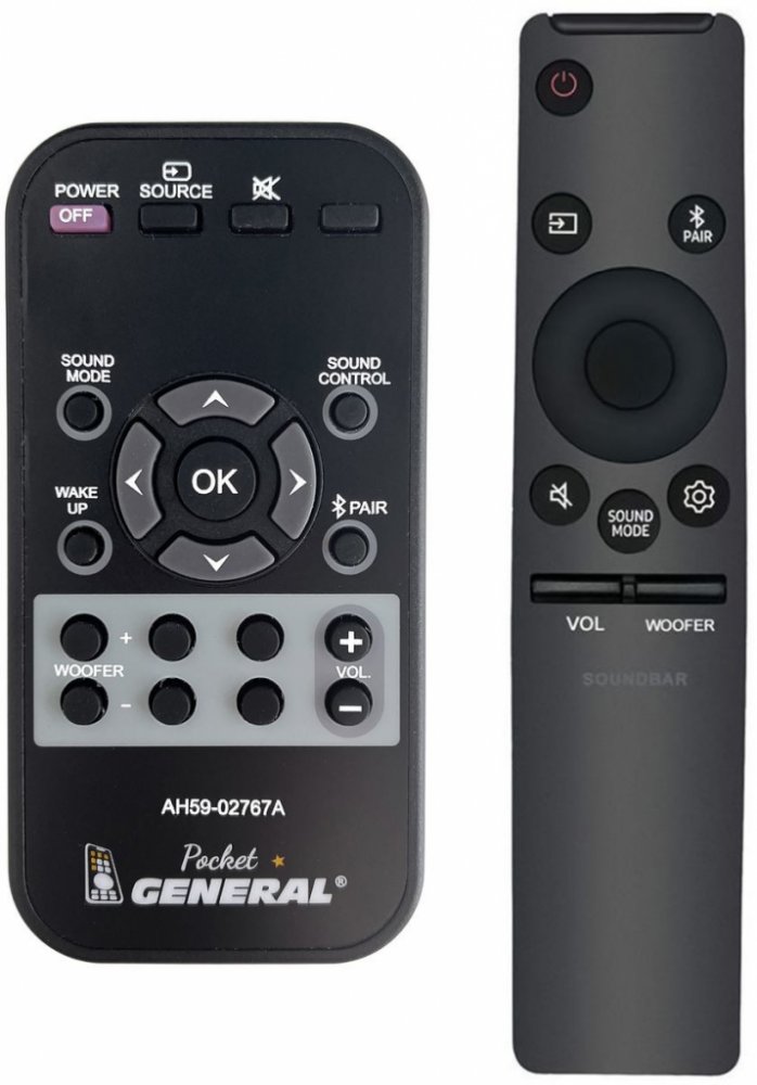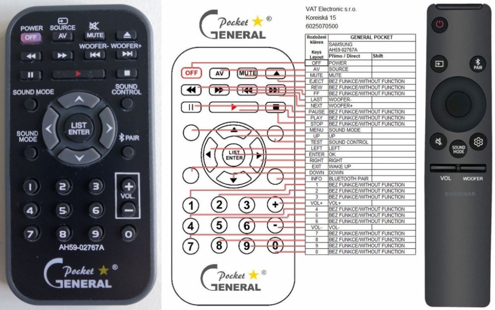 Dálkový ovladač SAMSUNG AH59-02767A (AH5902767A) duplikát 1:1 originálního dálkového ovladače. Dálkový ovladač je určen pro tyto modely SAMSUNG:HW-A430, HW-A450/ZA, HW-A470, HW-A550/ZA, HW-A650, HW-A650/ZA, HW-N450, HW-N450/EN, HW-N450/ZA, HW-N550, HW-N550/ZA, HW-N650, HW-N650/ZA, HW-N850, HW-N950, HW-N960/XE, HW-Q59CT, HW-Q600A, HW-Q60R, HW-Q60T, HW-Q67CT, HW-Q6CR, HW-Q6CT, HW-Q700A, HW-Q70R, HW-Q70T, HW-Q800T, HW-Q850T, HW-Q880R, HW-Q88888808080000R, HW-Q900T , HW-Q90R, HW-Q950T , HW-R450, HW-R47M, HW-R60C, HW-R650/ZA, HW-RR650, HW-S40T/ZA, HW-S41T, HW-S60T, HW-S61T, HW-T420 , HW-T450 , HW-T550, HW-T60M, HW-T650, HW-T650/ZA, HWA430, HWN450, HWN450/ZA, HWN550, HWN550/ZA, HWN5550/ZA, HWN650, HWN650/ZA, HWN960XE, HWQ850ZC, HWR450, PS-WR45BB, PS-WR75BB, W-S40T. (Nemusí zde být uvedeny úplně všechny kompatibilní modely. Pokud si nejste jisti, sdělte nám svůj model (použijte online chat, e-mail, telefon), neprodleně zkontrolujeme a ověříme, zda je tento ovladač kompatibilní s Vaším přístrojem. Za poskytnutou informaci ručíme.) Dálkový ovladač General POCKET duplikát má naprosto všechny funkce a popisky tlačítek stejné jako originální dálkový ovladač. Není třeba nic nastavovat, žádné kódy, funguje ihned po vložení baterií se všemi výše uvedenými modely.Ovladač je dodáván ve verzi značkového dálkového ovladače General POCKET duplikát (zobrazen vlevo) Jedná se o ovladač vyrobený pro specifické zařízení – NENÍ to univerzální ovladač! Má naprosto všechny funkce jako originální dálkový ovladač. Má stejné popisky tlačítek, jako jste byli zvyklí z originálu. Popisky tlačítek jsou velmi odolné a nejdou seškrábat ani hrubou silou. 3 roky záruka.General POCKET duplikát byl navržen a vyroben přesně podle originálního dálkového ovladače tlačítko po tlačítku. Ovladač je vyvinut a testován v České republice a podléhá CE a ROHS standardům. SNADNÉ INTUITIVNÍ POUŽÍVÁNÍ: Na rozdíl od běžných náhradních ovladačů, General POCKET duplikát má 100% odpovídající popisky tlačítek jako na originálním ovladač..