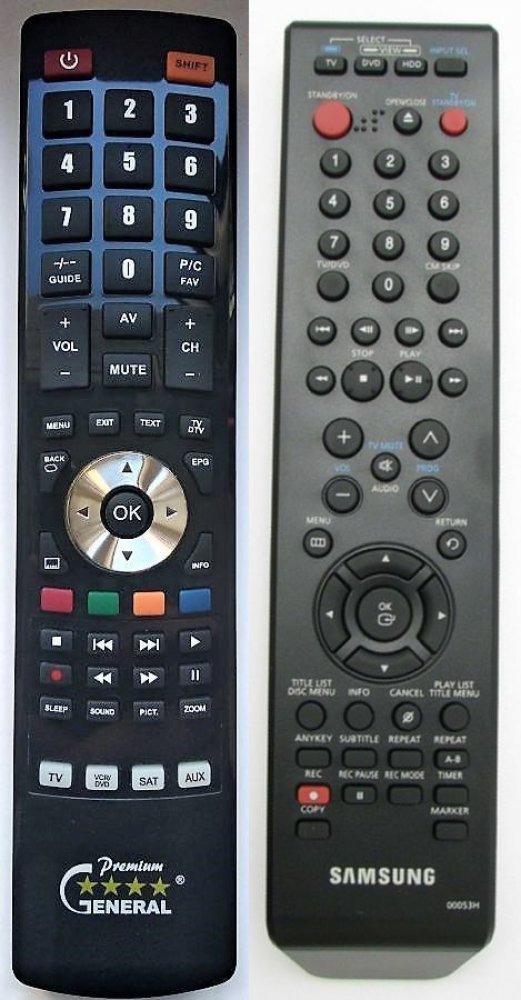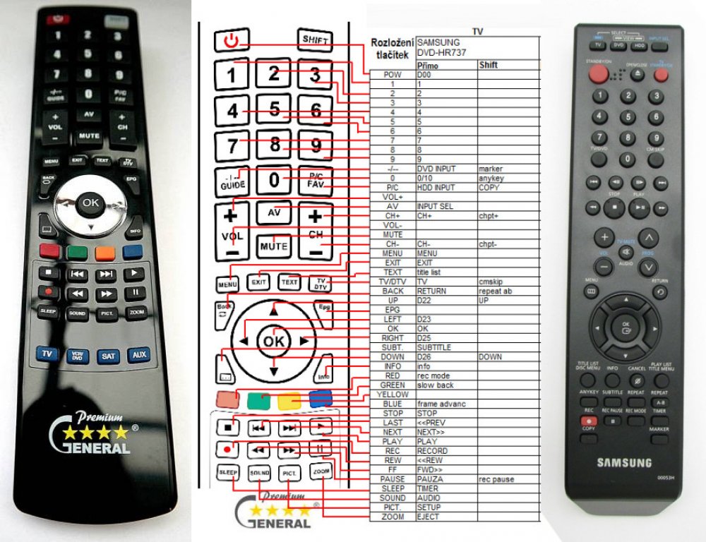 Náhradní dálkový ovladač SAMSUNG AK59-00053H (AK5900053H) - 100% náhrada 1:1 za originální dálkový ovladač. Dálkový ovladač byl vyvinut speciálně na míru pro tyto modely značky SAMSUNG:DVD-HR730, DVD-HR735, DVD-HR737, DVDHR730, DVDHR735, DVDHR737. (Nemusí zde být uvedeny úplně všechny kompatibilní modely. Pokud si nejste jisti, sdělte nám svůj model (použijte online chat, e-mail, telefon), neprodleně zkontrolujeme a ověříme, zda je tento ovladač kompatibilní s Vaším přístrojem. Za poskytnutou informaci ručíme.) Ovladač je dodáván ve verzi značkového dálkového ovladače General Premium (zobrazen vlevo). Garantujeme Vám, že dostanete ovladač, který plně nahradí Váš původní originální ovladač a bude mít naprosto všechny funkce stejné.Není to univerzální ovladač, ale ovladač, který je naprogramován a přímo určen pro modely přístrojů uvedené výše. Není třeba žádné párování, žádné kódy. Obdržíte od nás ovladač, který je připraven k použití - jediné, co musíte udělat, je vložit baterie a ovladač hned funguje. Podívejte se na obrázek ovladače a ujistěte se, že jsou v tabulce všechny funkce jako na původním originálním ovladači. Jedná se o plnohodnotný náhradní dálkový ovladač (není to „univerzál“). Má naprosto všechny funkce přesně jako originální ovladač. Záruční lhůta na ovladač je 3 roky. Dodáván také jednoduchý návod s mapováním funkcí. DOPLŇKOVÁ FUNKCE: Tento dálkový ovladač je možno naprogramovat na 1-4 zařízení (celkem tedy 4). Budete moci jedním ovladačem ovládat několik různých přístrojů jedním ovladačem. Pokud nám do komentáře v objednávce napíšete modely dalších přístrojů, naprogramujeme Vám ovladač na všechny. Za tuto doplňkovou službu bude naúčtován příplatek k ceně ovladače 50 Kč: více informacíV případě, že v budoucnu vyměníte/obměníte Vaši domácí elektroniku, jsme schopni Vám tento ovladač přeprogramovat na naprosto jakékoliv nové/á zařízení. Ovladač General přežije Váš stávající přístroj!