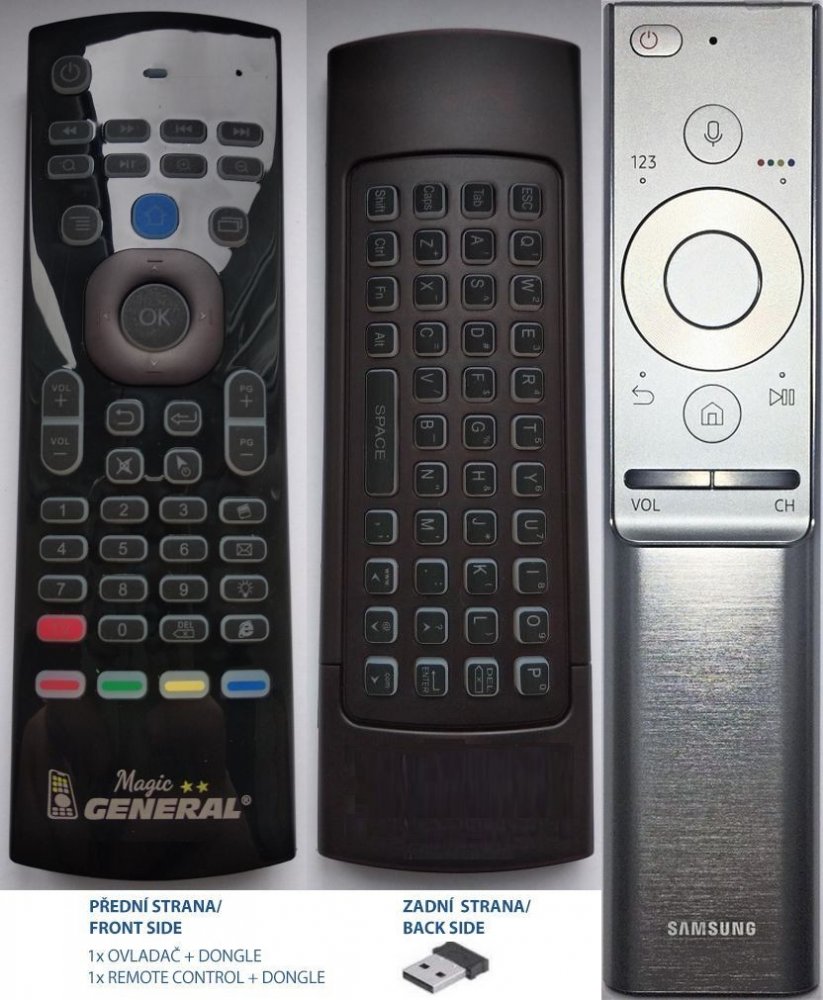 PLNOHODNOTNÁ náhrada magického dálkového ovladače SAMSUNG BN59-01265A (BN5901265A) s integrovanou klávesnicí a možností nastavení na další přístroje. Dálkový ovladač je určen pro tyto modely SAMSUNG: QA55Q7CAMK, QA55Q7CAMS, QA65Q7CAMK, QA65Q7CAMS, QA65Q7FAMK, QA65Q7FAMS, QA65Q8CAMK, QA65Q8CAMS, QA65Q9FAMK, QA65Q9FAMS, QA65Q9FAMW, QA75Q7FAMK, QE49Q6FN, QE49Q7, QE49Q7CAMT, QE49Q7FAMT, QE55Q7, QE55Q7CAMT, QE55Q7F, QE55Q7FAMU, QE55Q8, QE65Q7, QE65Q7CAMT, QE65Q8, QE65Q8FAML, QE65Q8FAMT, QE65Q8FGMT, QE65Q9, QE75Q7, QE75Q8, QN65Q7FAMF, QN65Q7FAMK, QN65Q7FAMP, QN65Q8CAMG, QN65Q8CAMK, QN65Q8CAMP, QN75Q8CAMG, QN75Q8CAMK, UE40MU6402U, UE40MU6440S, UE40MU6440U, UE40MU6442U, UE40MU6445U, UE40MU6450S, UE40MU6450U, UE40MU6452, UE40MU6452U, UE40MU6455U, UE40MU6470S, UE40MU6470U , UE40MU6472U, UE40MU6475U, UE43NU7442, UE43NU7472, UE49MU6402U, UE49MU6442U, UE49MU6452U, UE49MU6472U, UE49MU6640S, UE49MU6642U, UE49MU6645U, UE49MU6650S, UE49MU6652U, UE49MU6655U, UE49MU6670S, UE49MU6670U, UE49MU6672U, UE49MU6675U, UE49MU7052T, UE49MU7072T, UE55MU6272U, UE55MU6440S, UE55MU6440U, UE55MU6442U, UE55MU6445U, UE55MU6449U, UE55MU6450S, UE55MU6450U, UE55MU6452U, UE55MU6459U, UE55MU6470S, UE55MU6470U, UE55MU6472U, UE55MU6475U, UE55MU6479U, UE55MU6640S, UE55MU6642U, UE55MU6645U, UE55MU6650S, UE55MU6652, UE55MU6652U, UE55MU6655U, UE55MU6670S, UE55MU6670U, UE55MU6672U, UE55MU6675U, UE55MU7052T, UE55MU7072T, UE55NU7452, UE65MU6102K, UE65MU6440S, UE65MU6440U, UE65MU6442U, UE65MU6445U, UE65MU6449U, UE65MU6450S, UE65MU6450U, UE65MU6452U, UE65MU6455U, UE65MU6459U, UE65MU6470S, UE65MU6470U, UE65MU6472U, UE65MU6475, UE65MU6475U, UE65MU6479U, UE65MU6640S, UE65MU6642U, UE65MU6645U, UE65MU6650S, UE65MU6652U, UE65MU6655U, UE65MU6670S, UE65MU6670U, UE65MU6672U, UE65MU6675U, UE65MU7052T, UE75F8000SL, UE78KS9000L. (Nemusí zde být uvedeny úplně všechny kompatibilní modely. Pokud si nejste jisti, sdělte nám svůj model (použijte online chat, e-mail, telefon), neprodleně zkontrolujeme a ověříme, zda je tento ovladač kompatibilní s Vaším přístrojem. Za poskytnutou informaci ručíme.) Náhradní Ovladač je dodáván ve verzi luxusního multifunkčního air mouse ovladače s integrovanou klávesnicí General MAGIC (zobrazen vlevo). Ovladač dostanete již nakonfigurovaný na výše uvedené modely. Nevyžaduje žádné nastavování ani kódy. FUNKCE: 2,4G rádiová technologie ovládání pohybem pomocí Gyroskopu (tzv. létající myš), RF bezdrátová klávesnice plus IR dálkové ovládání s funkcí učení (3v1). SNADNÁ INSTALACE - PLUG a PLAY: Zasuňte USB adaptér do televizoru, počkejte několik sekund, dokud se na displeji neobjeví šipka a můžete hned začít používat. USB adaptér je součástí a je již spárován. Není třeba žádné další párování. Nevyžaduje od Vás žádné nastavování, ovladač Vám přijde již námi nakonfigurovaný na Vaši SMART TV. Vybalíte, vložíte baterie a ovládáte! Ale přesto nepřicházíte o možnost si nastavení ovladače General Magic sami upravovat podle Vašich potřeb (pokud se třeba budete u sledování TV nudit :-) General MAGIC se umí učit kódy z jakéhokoliv jiného IR ovladače DVD, HIFI, BLUE-RAY, AVR atd. Můžete si na ho naučit tak, že bude umět ovládat nejen Váš smart televizor, ale také všechny ostatní Vaše přístroje. Ovládání všeho jedním ovladače General SMART bude velmi snadné. General MAGIC funguje jako létající myš. Pomocí integrovaného gyroskopu umožňuje snadné ovládání pohybem ruky držící ovladač. Je to stejné jako by jste měli v ruce PC myš, která neleží na podložce, ale hýbete s ní v prostoru. Rychlost pohybu kurzoru na obrazovce lze nastavit. Klávesnice na zadní straně usnadní vyhledávání a zadávání v aplikacích a internetu. General MAGIC má 7 barev podsvícení, které můžete snadno změnit. Vyberte si barvu, která se vám nejvíce líbí! Ovladač si pamatuje nastavení. Ovladač nemá hlasové ovládání. Funguje se systémy Windows, Mac OS, Android, Linux. Perfektní citlivost a dosah přes 15 metrů díky rádiové technologii. Český uživatelský návod přiložen. V případě problému ochotná technická podpora na našem telefonu, emailu nebo na online chatu vpravo dole na této stránce (ale většinou není potřeba, námi napsaný návod s obrázky pochopí každý).