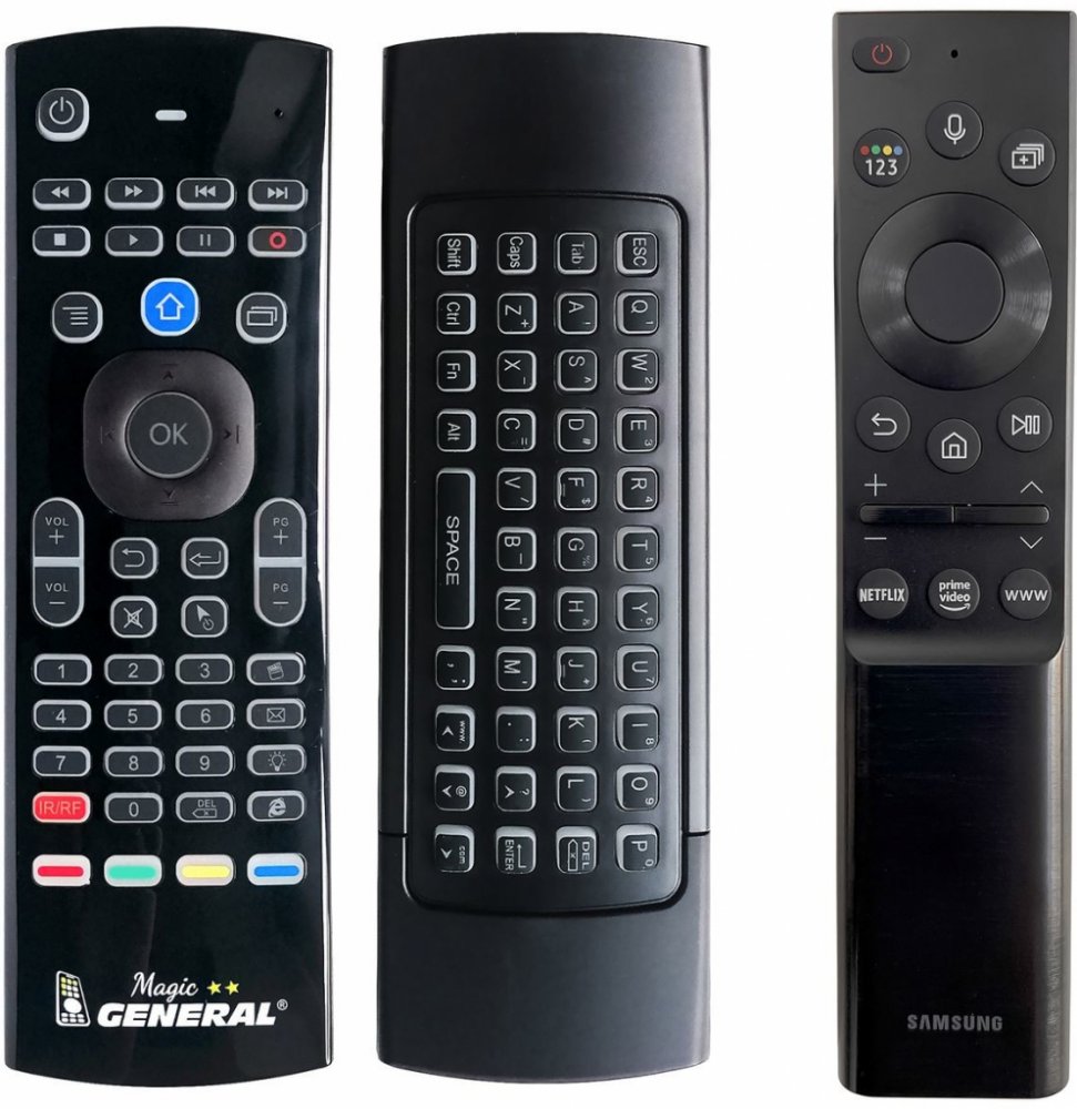PLNOHODNOTNÁ náhrada magického dálkového ovladače SAMSUNG BN59-01357C (BN5901357C) s integrovanou klávesnicí a možností nastavení na další přístroje. Dálkový ovladač je určen pro tyto modely SAMSUNG: QA50QN90AAWXXY, QA55Q60AAWXXY, QA55Q70AAWXXY, QA55Q80AAWXXY, QA55QN85AAWXXY, QA55QN90AAWXXY, QA65Q60AAWXXY, QA65Q70AAWXXY, QA65Q80AAWXXY, QA65QN85AAWXXY, QA65QN900AWXXY, QA65QN90AAWXXY, QA75Q60AAWXXY, QA75Q70AAWXXY, QA75QN85AAWXXY, QA75QN900AWXXY, QA75QN90AAWXXY, QA85Q60AAWXXY, QA85Q70AAWXXY, QA85QN800ASXNZ, QA85QN85AASXNZ, QA85QN85AAWXXY, QA85QN900ASXNZ, QA85QN900AWXXY. (Nemusí zde být uvedeny úplně všechny kompatibilní modely. Pokud si nejste jisti, sdělte nám svůj model (použijte online chat, e-mail, telefon), neprodleně zkontrolujeme a ověříme, zda je tento ovladač kompatibilní s Vaším přístrojem. Za poskytnutou informaci ručíme.) Náhradní Ovladač je dodáván ve verzi luxusního multifunkčního air mouse ovladače s integrovanou klávesnicí General MAGIC (zobrazen vlevo). Ovladač dostanete již nakonfigurovaný na výše uvedené modely. Nevyžaduje žádné nastavování ani kódy. FUNKCE: 2,4G rádiová technologie ovládání pohybem pomocí Gyroskopu (tzv. létající myš), RF bezdrátová klávesnice plus IR dálkové ovládání s funkcí učení (3v1). SNADNÁ INSTALACE - PLUG a PLAY: Zasuňte USB adaptér do televizoru, počkejte několik sekund, dokud se na displeji neobjeví šipka a můžete hned začít používat. USB adaptér je součástí a je již spárován. Není třeba žádné další párování. Nevyžaduje od Vás žádné nastavování, ovladač Vám přijde již námi nakonfigurovaný na Vaši SMART TV. Vybalíte, vložíte baterie a ovládáte! Ale přesto nepřicházíte o možnost si nastavení ovladače General Magic sami upravovat podle Vašich potřeb (pokud se třeba budete u sledování TV nudit :-) General MAGIC se umí učit kódy z jakéhokoliv jiného IR ovladače DVD, HIFI, BLUE-RAY, AVR atd. Můžete si na ho naučit tak, že bude umět ovládat nejen Váš smart televizor, ale také všechny ostatní Vaše přístroje. Ovládání všeho jedním ovladače General SMART bude velmi snadné. General MAGIC funguje jako létající myš. Pomocí integrovaného gyroskopu umožňuje snadné ovládání pohybem ruky držící ovladač. Je to stejné jako by jste měli v ruce PC myš, která neleží na podložce, ale hýbete s ní v prostoru. Rychlost pohybu kurzoru na obrazovce lze nastavit. Klávesnice na zadní straně usnadní vyhledávání a zadávání v aplikacích a internetu. General MAGIC má 7 barev podsvícení, které můžete snadno změnit. Vyberte si barvu, která se vám nejvíce líbí! Ovladač si pamatuje nastavení. Ovladač nemá hlasové ovládání. Funguje se systémy Windows, Mac OS, Android, Linux. Perfektní citlivost a dosah přes 15 metrů díky rádiové technologii. Český uživatelský návod přiložen. V případě problému ochotná technická podpora na našem telefonu, emailu nebo na online chatu vpravo dole na této stránce (ale většinou není potřeba, námi napsaný návod s obrázky pochopí každý).