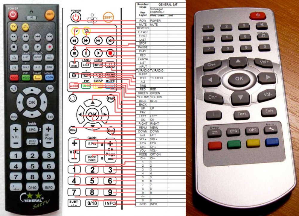 Náhradní dálkový ovladač SCHWAIGER DSR-5009-T (DSR5009T) - 100procent náhrada 1:1 za originální dálkový ovladač. Dálkový ovladač je určen pro tyto modely SCHWAIGER: DSR-5009-T, DSR-5009T, DSR5009-T, DSR5009T. (Nemusí zde být uvedeny úplně všechny kompatibilní modely. Pokud si nejste jisti, sdělte nám svůj model (použijte online chat, e-mail, telefon), neprodleně zkontrolujeme a ověříme, zda je tento ovladač kompatibilní s Vaším přístrojem. Za poskytnutou informaci ručíme.) Ovladač je dodáván ve verzi značkového dálkového ovladače General SAT/TV (zobrazen vlevo). Garantujeme Vám, že dostanete ovladač, který plně nahradí Váš původní originální ovladač a bude mít naprosto všechny funkce. Není to univerzální ovladač, ale ovladač, který je naprogramován a přímo určen pro modely přístrojů uvedené výše. Není třeba žádné párování, žádné kódy. Obdržíte od nás ovladač, který je připraven k použití - jediné, co musíte udělat, je vložit baterie a ovladač hned funguje. Podívejte se na obrázek ovladače a ujistěte se, že jsou v tabulce všechny funkce jako na původním originálním ovladači. Jedná se o plnohodnotný náhradní dálkový ovladač (není to „univerzál“). Má naprosto všechny funkce přesně jako originální ovladač. Záruční lhůta na ovladač je 2 roky. Dodáván také jednoduchý návod s mapováním funkcí. DOPLŇKOVÁ FUNKCE: Tento dálkový ovladač je možno naprogramovat na 1 další přístroj. Budete moci jedním ovladačem ovládat oba přístroje (např. SAT plus TV nebo SAT plus DVD apod). Pokud nám do komentáře v objednávce napíšete model dalšího přístroje, naprogramujeme Vám ovladač na oba. Za tuto doplňkovou službu bude naúčtován příplatek k ceně ovladače 50 Kč: více informací