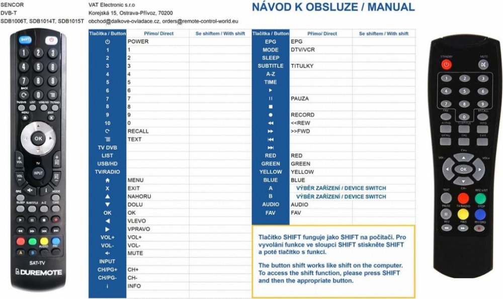 Náhradní dálkový ovladač SENCOR SDB-1006T, SDB-1014T, SDB-1015T (SDB1006T, SDB1014T, SDB1015T) - 100% náhrada 1:1 za originální dálkový ovladač. Dálkový ovladač byl vyvinut speciálně na míru pro tyto modely značky SENCOR:., HYUNDAI DVB-T 150 U, SDB-1006T, SDB-1014T, SDB-1015T, SDB1006T, SDB1014, SDB1014T, SDB1015, SDB1015T, SDB5003T SE, SHINELCO DTD-210, STEINER STT 110, STEINER STT110. (Nemusí zde být uvedeny úplně všechny kompatibilní modely. Pokud si nejste jisti, sdělte nám svůj model (použijte online chat, e-mail, telefon), neprodleně zkontrolujeme a ověříme, zda je tento ovladač kompatibilní s Vaším přístrojem. Za poskytnutou informaci ručíme.) Ovladač je dodáván ve verzi značkového dálkového ovladače General SAT/TV (zobrazen vlevo). Garantujeme Vám, že dostanete ovladač, který plně nahradí Váš původní originální ovladač a bude mít naprosto všechny funkce stejné.Není to univerzální ovladač, ale ovladač, který je naprogramován a přímo určen pro modely přístrojů uvedené výše. Není třeba žádné párování, žádné kódy. Obdržíte od nás ovladač, který je připraven k použití - jediné, co musíte udělat, je vložit baterie a ovladač hned funguje. Podívejte se na obrázek ovladače a ujistěte se, že jsou v tabulce všechny funkce jako na původním originálním ovladači. Jedná se o plnohodnotný náhradní dálkový ovladač (není to „univerzál“). Má naprosto všechny funkce přesně jako originální ovladač. Záruční lhůta na ovladač je 3 roky. Dodáván také jednoduchý návod s mapováním funkcí. DOPLŇKOVÁ FUNKCE: Tento dálkový ovladač je možno naprogramovat na 1 další přístroj. Budete moci jedním ovladačem ovládat oba přístroje (např. SAT+TV nebo SAT+DVD apod). Pokud nám do komentáře v objednávce napíšete model dalšího přístroje, naprogramujeme Vám ovladač na oba. Za tuto doplňkovou službu bude naúčtován příplatek k ceně ovladače 50 Kč: více informací