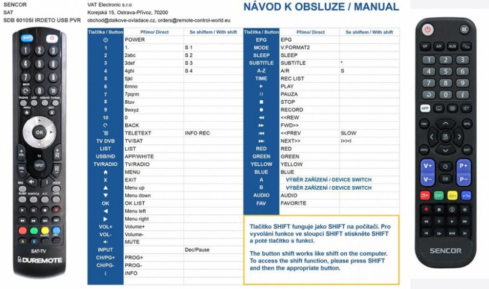 Náhradní dálkový ovladač SENCOR SDB 6010SI IRDETO USB PVR - 100% náhrada 1:1 za originální dálkový ovladač. Dálkový ovladač byl vyvinut speciálně na míru pro tyto modely značky SENCOR:SDB 6010SI IRDETO USB PVR, SDB6010SI. (Nemusí zde být uvedeny úplně všechny kompatibilní modely. Pokud si nejste jisti, sdělte nám svůj model (použijte online chat, e-mail, telefon), neprodleně zkontrolujeme a ověříme, zda je tento ovladač kompatibilní s Vaším přístrojem. Za poskytnutou informaci ručíme.) Ovladač je dodáván ve verzi značkového dálkového ovladače General Duremote (zobrazen vlevo). Garantujeme Vám, že dostanete ovladač, který plně nahradí Váš původní originální ovladač a bude mít naprosto všechny funkce stejné.Není to univerzální ovladač, ale ovladač, který je naprogramován a přímo určen pro modely přístrojů uvedené výše. Není třeba žádné párování, žádné kódy. Obdržíte od nás ovladač, který je připraven k použití - jediné, co musíte udělat, je vložit baterie a ovladač hned funguje. Podívejte se na obrázek ovladače a ujistěte se, že jsou v tabulce všechny funkce jako na původním originálním ovladači. Jedná se o plnohodnotný náhradní dálkový ovladač (není to „univerzál“). Má naprosto všechny funkce přesně jako originální ovladač. Záruční lhůta na ovladač je 3 roky. Dodáván také jednoduchý návod s mapováním funkcí. DOPLŇKOVÁ FUNKCE: Tento dálkový ovladač je možno naprogramovat na 1 další přístroj. Budete moci jedním ovladačem ovládat oba přístroje. Pokud nám do komentáře v objednávce napíšete model dalšího přístroje, naprogramujeme Vám ovladač na oba. Za tuto doplňkovou službu bude naúčtován příplatek k ceně ovladače 50 Kč: více informací