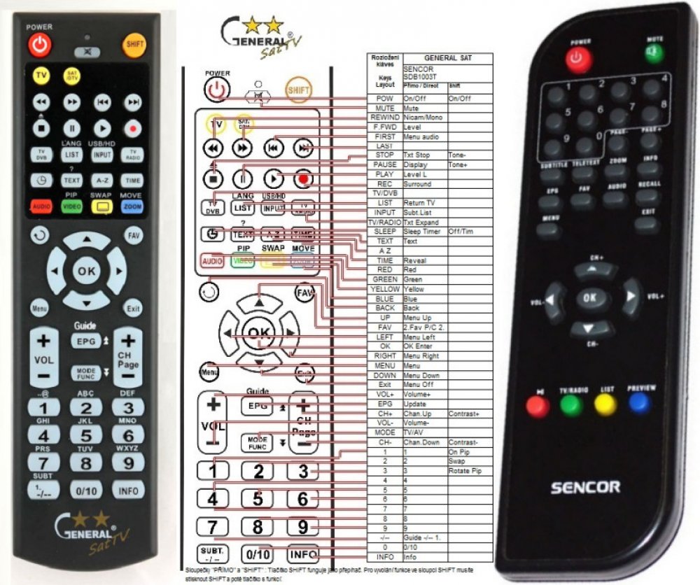 Náhradní dálkový ovladač SENCOR SDB1003T - 100% náhrada 1:1 za originální dálkový ovladač. Dálkový ovladač byl vyvinut speciálně na míru pro tyto modely značky SENCOR:SDB 1003 T, SDB1003, SDB1003T. (Nemusí zde být uvedeny úplně všechny kompatibilní modely. Pokud si nejste jisti, sdělte nám svůj model (použijte online chat, e-mail, telefon), neprodleně zkontrolujeme a ověříme, zda je tento ovladač kompatibilní s Vaším přístrojem. Za poskytnutou informaci ručíme.) Ovladač je dodáván ve verzi značkového dálkového ovladače General SAT/TV (zobrazen vlevo). Garantujeme Vám, že dostanete ovladač, který plně nahradí Váš původní originální ovladač a bude mít naprosto všechny funkce stejné.Není to univerzální ovladač, ale ovladač, který je naprogramován a přímo určen pro modely přístrojů uvedené výše. Není třeba žádné párování, žádné kódy. Obdržíte od nás ovladač, který je připraven k použití - jediné, co musíte udělat, je vložit baterie a ovladač hned funguje. Podívejte se na obrázek ovladače a ujistěte se, že jsou v tabulce všechny funkce jako na původním originálním ovladači. Jedná se o plnohodnotný náhradní dálkový ovladač (není to „univerzál“). Má naprosto všechny funkce přesně jako originální ovladač. Záruční lhůta na ovladač je 3 roky. Dodáván také jednoduchý návod s mapováním funkcí. DOPLŇKOVÁ FUNKCE: Tento dálkový ovladač je možno naprogramovat na 1 další přístroj. Budete moci jedním ovladačem ovládat oba přístroje (např. SAT+TV nebo SAT+DVD apod). Pokud nám do komentáře v objednávce napíšete model dalšího přístroje, naprogramujeme Vám ovladač na oba. Za tuto doplňkovou službu bude naúčtován příplatek k ceně ovladače 50 Kč: více informací