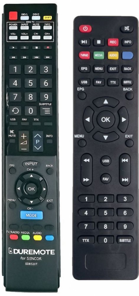 Dálkový ovladač SENCOR SDB520T, SDB521T duplikát 1:1 originálního dálkového ovladače. Dálkový ovladač byl vyvinut speciálně na míru pro tyto modely značky SENCOR:SDB-520T, SDB-521T, SDB520T, SDB521T, SDB523T. (Nemusí zde být uvedeny úplně všechny kompatibilní modely. Pokud si nejste jisti, sdělte nám svůj model (použijte online chat, e-mail, telefon), neprodleně zkontrolujeme a ověříme, zda je tento ovladač kompatibilní s Vaším přístrojem. Za poskytnutou informaci ručíme.) Dálkový ovladač General Duremote má naprosto všechny funkce a popisky tlačítek stejné jako originální dálkový ovladač. Není třeba nic nastavovat, žádné kódy, funguje ihned po vložení baterií se všemi výše uvedenými modely.Ovladač je dodáván ve verzi značkového dálkového ovladače General Duremote (zobrazen vlevo)DUPLIKÁT 2 v 1: Tento ovladač má sekci tlačítek MINI-TV pro funkce, které jej můžete naučit z Vašeho TV ovladače. To znamená, že jedním ovladačem můžete ovládat 2 přístroje, například set top box + základní funkce TV. Způsob učení tlačítek naleznete v přiloženém návodu v krabičce, ve které Vám bude ovladač dodán. Jedná se o ovladač vyrobený pro specifické zařízení – NENÍ to univerzální ovladač! Má naprosto všechny funkce jako originální dálkový ovladač. Má stejné popisky tlačítek, jako jste byli zvyklí z originálu. Popisky tlačítek jsou velmi odolné a nejdou seškrábat ani hrubou silou. 3 roky záruka.General Duremote byl navržen a vyroben přesně podle originálního dálkového ovladače tlačítko po tlačítku. Ovladač je vyvinut a testován v České republice a podléhá CE a ROHS standardům. SNADNÉ INTUITIVNÍ POUŽÍVÁNÍ: Na rozdíl od běžných náhradních ovladačů, General Duremote má 100% odpovídající popisky tlačítek jako na originálním ovladači. Srovnání: Jiné univerzální nebo programovatelné náhrady mají kvůli snížení nákladů názvy/popisky a rozložení tlačítek univerzální, popisky tlačítek často neodpovídají funkci tlačítka a vyžadují tedy návody k použití. To často vede k nejasnostem, co které tlačítko dělá..