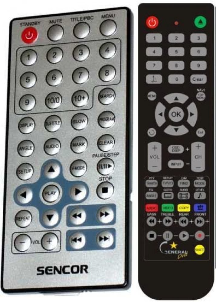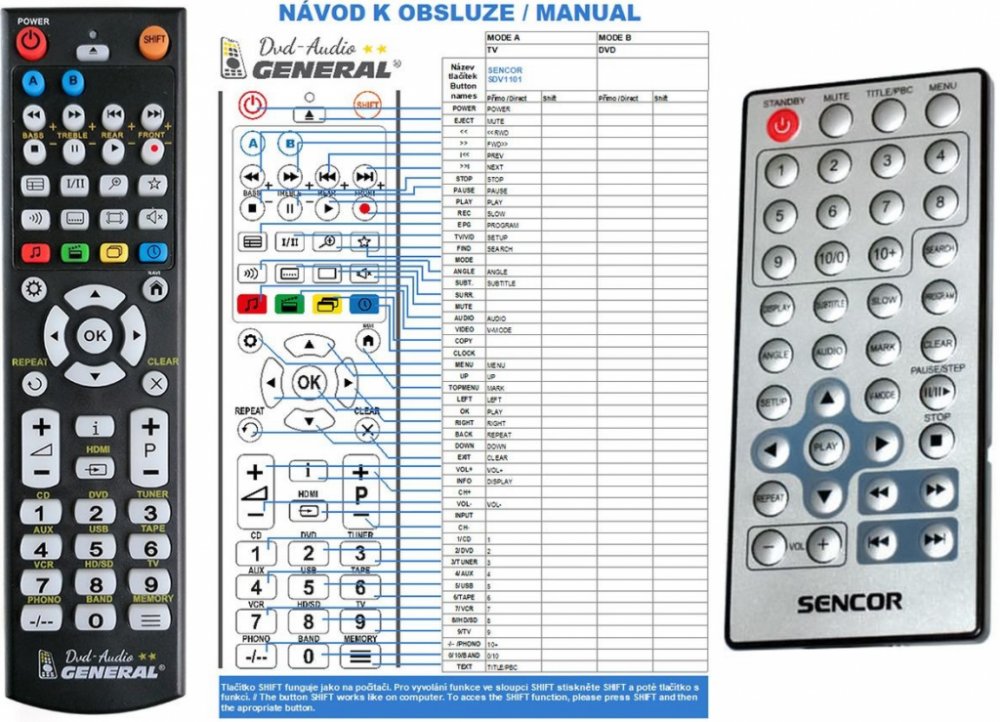 Náhradní dálkový ovladač SENCOR SDV-1101 (SDV1101) - 100% náhrada 1:1 za originální dálkový ovladač. Dálkový ovladač byl vyvinut speciálně na míru pro tyto modely značky SENCOR:SDV-1101, SDV1101. (Nemusí zde být uvedeny úplně všechny kompatibilní modely. Pokud si nejste jisti, sdělte nám svůj model (použijte online chat, e-mail, telefon), neprodleně zkontrolujeme a ověříme, zda je tento ovladač kompatibilní s Vaším přístrojem. Za poskytnutou informaci ručíme.) Ovladač je dodáván ve verzi značkového dálkového ovladače General DVD/AUDIO (zobrazen vlevo). Garantujeme Vám, že dostanete ovladač, který plně nahradí Váš původní originální ovladač a bude mít naprosto všechny funkce stejné.Není to univerzální ovladač, ale ovladač, který je naprogramován a přímo určen pro modely přístrojů uvedené výše. Není třeba žádné párování, žádné kódy. Obdržíte od nás ovladač, který je připraven k použití - jediné, co musíte udělat, je vložit baterie a ovladač hned funguje. Podívejte se na obrázek ovladače a ujistěte se, že jsou v tabulce všechny funkce jako na původním originálním ovladači. Jedná se o plnohodnotný náhradní dálkový ovladač (není to „univerzál“). Má naprosto všechny funkce přesně jako originální ovladač. Záruční lhůta na ovladač je 3 roky. Dodáván také jednoduchý návod s mapováním funkcí. DOPLŇKOVÁ FUNKCE: Tento dálkový ovladač je možno naprogramovat na 1 další přístroj. Budete moci jedním ovladačem ovládat oba přístroje (např. DVD+TV nebo SOUNDBAR+TV apod.). Pokud nám do komentáře v objednávce napíšete model dalšího přístroje, naprogramujeme Vám ovladač na oba. Za tuto doplňkovou službu bude naúčtován příplatek k ceně ovladače 50 Kč: více informací