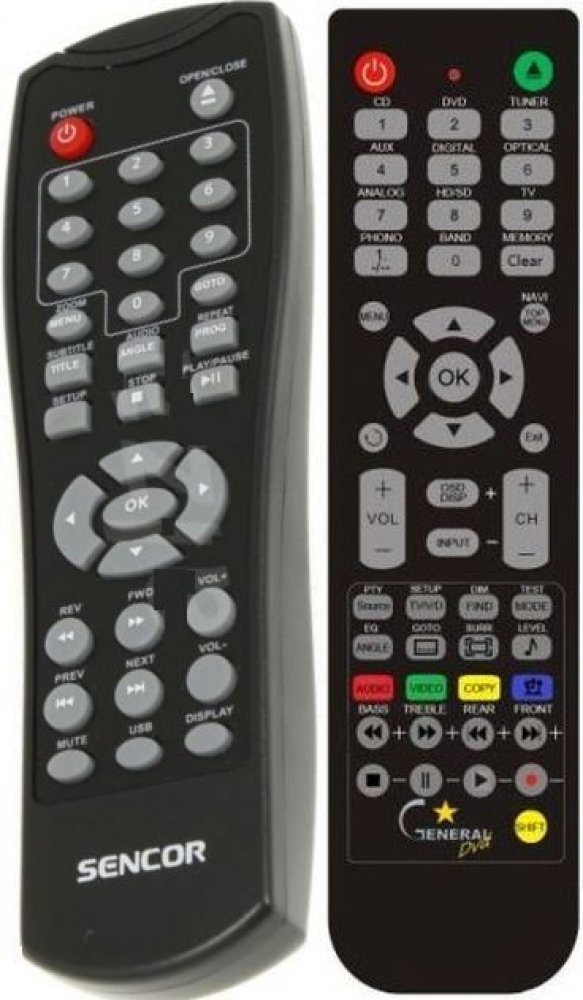 Náhradní dálkový ovladač SENCOR SDV-2510 (SDV2510) - 100procent náhrada 1:1 za originální dálkový ovladač. Dálkový ovladač je určen pro tyto modely SENCOR: SDV 2510, SDV-2510, SDV2510. (Nemusí zde být uvedeny úplně všechny kompatibilní modely. Pokud si nejste jisti, sdělte nám svůj model (použijte online chat, e-mail, telefon), neprodleně zkontrolujeme a ověříme, zda je tento ovladač kompatibilní s Vaším přístrojem. Za poskytnutou informaci ručíme.) Ovladač je dodáván ve verzi značkového dálkového ovladače General DVD/AUDIO (zobrazen vlevo). Garantujeme Vám, že dostanete ovladač, který plně nahradí Váš původní originální ovladač a bude mít naprosto všechny funkce. Není to univerzální ovladač, ale ovladač, který je naprogramován a přímo určen pro modely přístrojů uvedené výše. Není třeba žádné párování, žádné kódy. Obdržíte od nás ovladač, který je připraven k použití - jediné, co musíte udělat, je vložit baterie a ovladač hned funguje. Podívejte se na obrázek ovladače a ujistěte se, že jsou v tabulce všechny funkce jako na původním originálním ovladači. Jedná se o plnohodnotný náhradní dálkový ovladač (není to „univerzál“). Má naprosto všechny funkce přesně jako originální ovladač. Záruční lhůta na ovladač je 2 roky. Dodáván také jednoduchý návod s mapováním funkcí. DOPLŇKOVÁ FUNKCE: Tento dálkový ovladač je možno naprogramovat na 1 další přístroj. Budete moci jedním ovladačem ovládat oba přístroje (např. DVD plus TV nebo SOUNDBAR plus TV apod.). Pokud nám do komentáře v objednávce napíšete model dalšího přístroje, naprogramujeme Vám ovladač na oba. Za tuto doplňkovou službu bude naúčtován příplatek k ceně ovladače 50 Kč: více informací
