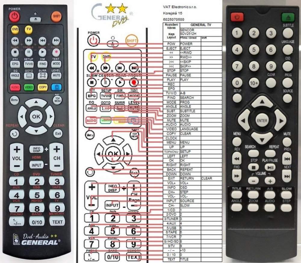 Náhradní dálkový ovladač SENCOR SDV2512H - 100procent náhrada 1:1 za originální dálkový ovladač. Dálkový ovladač je určen pro tyto modely SENCOR: SDV-1204H, SDV-2512H, SDV-7407H, SDV1204H, SDV2512H, SDV7407H. (Nemusí zde být uvedeny úplně všechny kompatibilní modely. Pokud si nejste jisti, sdělte nám svůj model (použijte online chat, e-mail, telefon), neprodleně zkontrolujeme a ověříme, zda je tento ovladač kompatibilní s Vaším přístrojem. Za poskytnutou informaci ručíme.) Ovladač je dodáván ve verzi značkového dálkového ovladače General DVD/AUDIO (zobrazen vlevo). Garantujeme Vám, že dostanete ovladač, který plně nahradí Váš původní originální ovladač a bude mít naprosto všechny funkce. Není to univerzální ovladač, ale ovladač, který je naprogramován a přímo určen pro modely přístrojů uvedené výše. Není třeba žádné párování, žádné kódy. Obdržíte od nás ovladač, který je připraven k použití - jediné, co musíte udělat, je vložit baterie a ovladač hned funguje. Podívejte se na obrázek ovladače a ujistěte se, že jsou v tabulce všechny funkce jako na původním originálním ovladači. Jedná se o plnohodnotný náhradní dálkový ovladač (není to „univerzál“). Má naprosto všechny funkce přesně jako originální ovladač. Záruční lhůta na ovladač je 2 roky. Dodáván také jednoduchý návod s mapováním funkcí. DOPLŇKOVÁ FUNKCE: Tento dálkový ovladač je možno naprogramovat na 1 další přístroj. Budete moci jedním ovladačem ovládat oba přístroje (např. DVD plus TV nebo SOUNDBAR plus TV apod.). Pokud nám do komentáře v objednávce napíšete model dalšího přístroje, naprogramujeme Vám ovladač na oba. Za tuto doplňkovou službu bude naúčtován příplatek k ceně ovladače 50 Kč: více informací