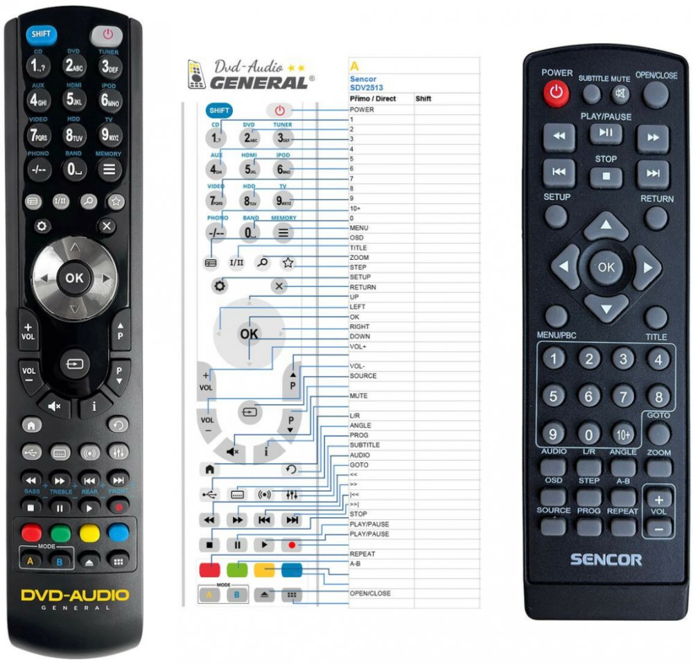 Náhradní dálkový ovladač SENCOR SDV2513 - 100% náhrada 1:1 za originální dálkový ovladač. Ovladač je dodáván ve verzi značkového dálkového ovladače General DVD/AUDIO (zobrazen vlevo). Garantujeme Vám, že dostanete ovladač, který plně nahradí Váš původní originální ovladač a bude mít naprosto všechny funkce stejné.Není to univerzální ovladač, ale ovladač, který je naprogramován a přímo určen pro mo