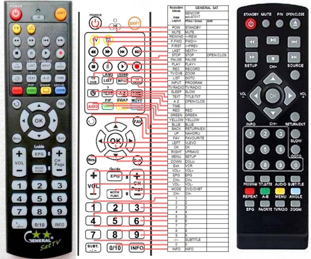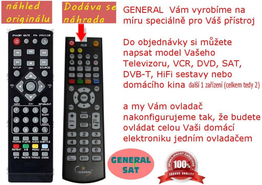 Doplňková funkce: General SAT-TV Vám můžeme kromě poptávaného zařízení také naprogramovat na další 1 zařízení (celkem tedy 2) např. TV, DVD, VCR, DVB-T, SAT, AUDIO, Hi-Fi, domácí kino atd., jelikož naše databáze kódu je více než obsáhlá a neustále se rozšiřuje.