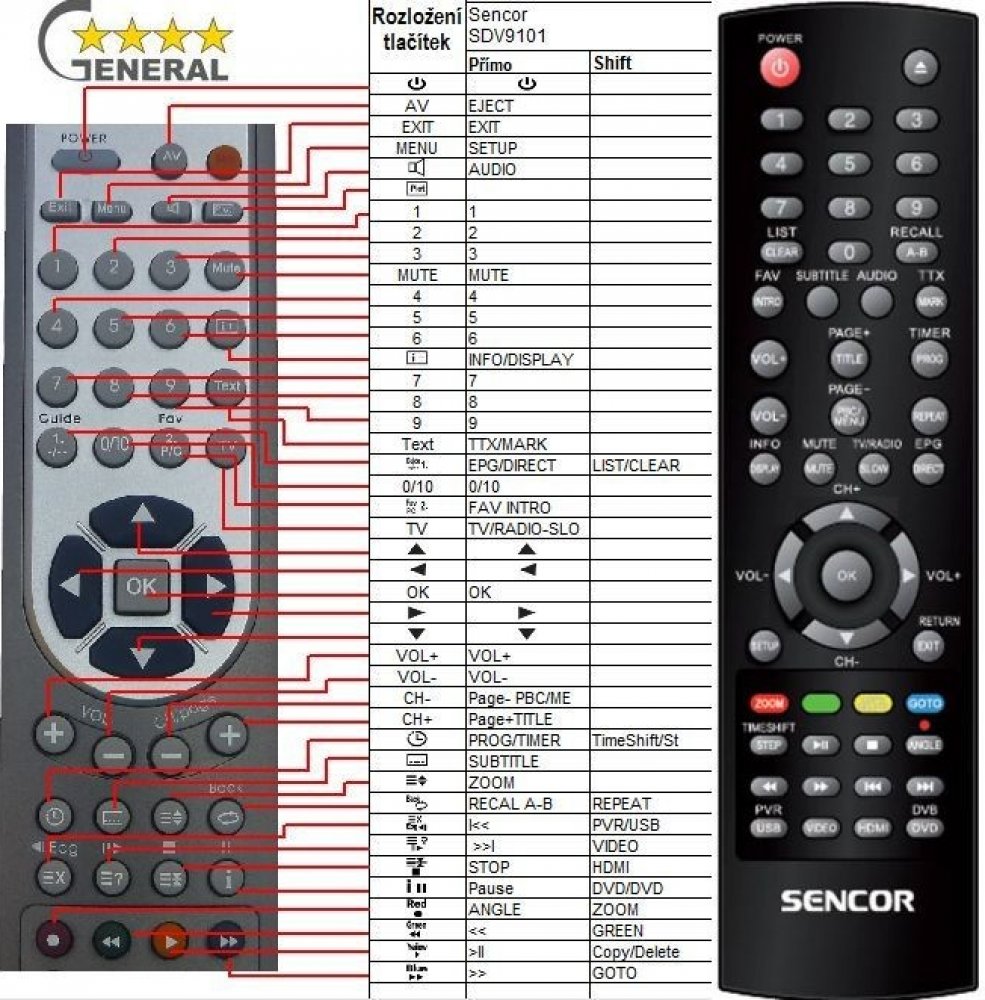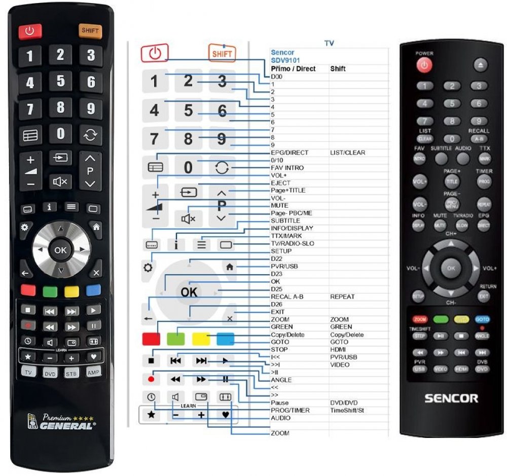 Náhradní dálkový ovladač SENCOR SDV-9101T (SDV9101T) - 100% náhrada 1:1 za originální dálkový ovladač. Dálkový ovladač byl vyvinut speciálně na míru pro tyto modely značky SENCOR:SDV 9101, SDV 9101T, SDV-9101, SDV-9101T, SDV9101, SDV9101T. (Nemusí zde být uvedeny úplně všechny kompatibilní modely. Pokud si nejste jisti, sdělte nám svůj model (použijte online chat, e-mail, telefon), neprodleně zkontrolujeme a ověříme, zda je tento ovladač kompatibilní s Vaším přístrojem. Za poskytnutou informaci ručíme.) Ovladač je dodáván ve verzi značkového dálkového ovladače General Premium (zobrazen vlevo). Garantujeme Vám, že dostanete ovladač, který plně nahradí Váš původní originální ovladač a bude mít naprosto všechny funkce stejné.Není to univerzální ovladač, ale ovladač, který je naprogramován a přímo určen pro modely přístrojů uvedené výše. Není třeba žádné párování, žádné kódy. Obdržíte od nás ovladač, který je připraven k použití - jediné, co musíte udělat, je vložit baterie a ovladač hned funguje. Podívejte se na obrázek ovladače a ujistěte se, že jsou v tabulce všechny funkce jako na původním originálním ovladači. Jedná se o plnohodnotný náhradní dálkový ovladač (není to „univerzál“). Má naprosto všechny funkce přesně jako originální ovladač. Záruční lhůta na ovladač je 3 roky. Dodáván také jednoduchý návod s mapováním funkcí. DOPLŇKOVÁ FUNKCE: Tento dálkový ovladač je možno naprogramovat na 1-4 zařízení (celkem tedy 4). Budete moci jedním ovladačem ovládat několik různých přístrojů jedním ovladačem. Pokud nám do komentáře v objednávce napíšete modely dalších přístrojů, naprogramujeme Vám ovladač na všechny. Za tuto doplňkovou službu bude naúčtován příplatek k ceně ovladače 50 Kč: více informacíV případě, že v budoucnu vyměníte/obměníte Vaši domácí elektroniku, jsme schopni Vám tento ovladač přeprogramovat na naprosto jakékoliv nové/á zařízení. Ovladač General přežije Váš stávající přístroj!