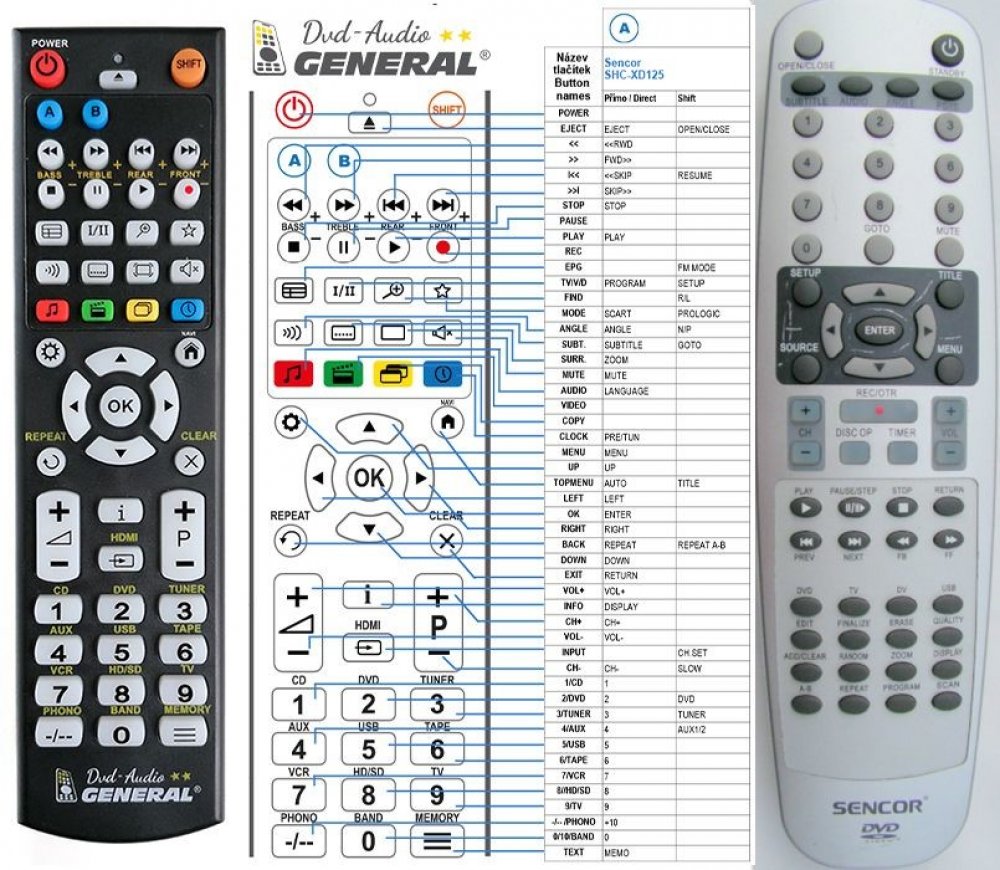 Náhradní dálkový ovladač SENCOR SHC-XD125, SHC-XD510 (SHCXD125, SHCXD510) - 100% náhrada 1:1 za originální dálkový ovladač. Dálkový ovladač byl vyvinut speciálně na míru pro tyto modely značky SENCOR:SHC XD125, SHC XD510, SHC-XD125, SHC-XD510, SHCXD125, SHCXD510. (Nemusí zde být uvedeny úplně všechny kompatibilní modely. Pokud si nejste jisti, sdělte nám svůj model (použijte online chat, e-mail, telefon), neprodleně zkontrolujeme a ověříme, zda je tento ovladač kompatibilní s Vaším přístrojem. Za poskytnutou informaci ručíme.) Ovladač je dodáván ve verzi značkového dálkového ovladače General DVD/AUDIO (zobrazen vlevo). Garantujeme Vám, že dostanete ovladač, který plně nahradí Váš původní originální ovladač a bude mít naprosto všechny funkce stejné.Není to univerzální ovladač, ale ovladač, který je naprogramován a přímo určen pro modely přístrojů uvedené výše. Není třeba žádné párování, žádné kódy. Obdržíte od nás ovladač, který je připraven k použití - jediné, co musíte udělat, je vložit baterie a ovladač hned funguje. Podívejte se na obrázek ovladače a ujistěte se, že jsou v tabulce všechny funkce jako na původním originálním ovladači. Jedná se o plnohodnotný náhradní dálkový ovladač (není to „univerzál“). Má naprosto všechny funkce přesně jako originální ovladač. Záruční lhůta na ovladač je 3 roky. Dodáván také jednoduchý návod s mapováním funkcí. DOPLŇKOVÁ FUNKCE: Tento dálkový ovladač je možno naprogramovat na 1 další přístroj. Budete moci jedním ovladačem ovládat oba přístroje (např. DVD+TV nebo SOUNDBAR+TV apod.). Pokud nám do komentáře v objednávce napíšete model dalšího přístroje, naprogramujeme Vám ovladač na oba. Za tuto doplňkovou službu bude naúčtován příplatek k ceně ovladače 50 Kč: více informací