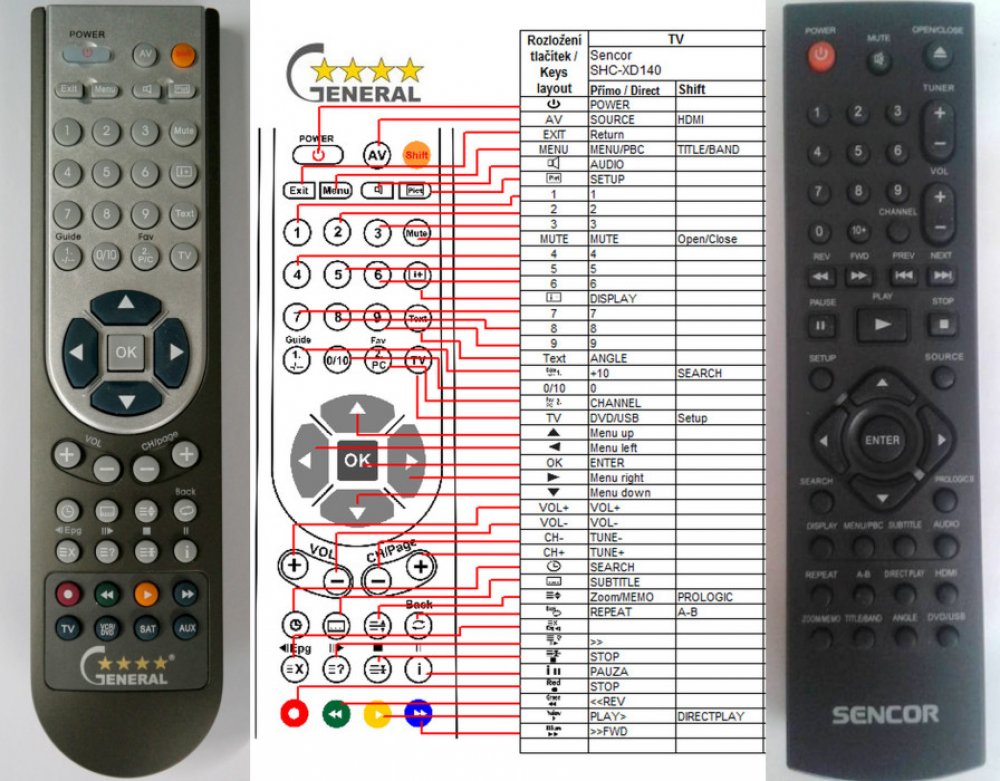Náhradní dálkový ovladač SENCOR SHC-XD140, SHC-XD570 (SHCXD140, SHCXD570) - 100% náhrada 1:1 za originální dálkový ovladač. Dálkový ovladač byl vyvinut speciálně na míru pro tyto modely značky SENCOR:SHC XD140, SHC XD570, SHC-XD140, SHC-XD570, SHCXD140, SHCXD570. (Nemusí zde být uvedeny úplně všechny kompatibilní modely. Pokud si nejste jisti, sdělte nám svůj model (použijte online chat, e-mail, telefon), neprodleně zkontrolujeme a ověříme, zda je tento ovladač kompatibilní s Vaším přístrojem. Za poskytnutou informaci ručíme.) Ovladač je dodáván ve verzi značkového dálkového ovladače General Premium (zobrazen vlevo). Garantujeme Vám, že dostanete ovladač, který plně nahradí Váš původní originální ovladač a bude mít naprosto všechny funkce stejné.Není to univerzální ovladač, ale ovladač, který je naprogramován a přímo určen pro modely přístrojů uvedené výše. Není třeba žádné párování, žádné kódy. Obdržíte od nás ovladač, který je připraven k použití - jediné, co musíte udělat, je vložit baterie a ovladač hned funguje. Podívejte se na obrázek ovladače a ujistěte se, že jsou v tabulce všechny funkce jako na původním originálním ovladači. Jedná se o plnohodnotný náhradní dálkový ovladač (není to „univerzál“). Má naprosto všechny funkce přesně jako originální ovladač. Záruční lhůta na ovladač je 3 roky. Dodáván také jednoduchý návod s mapováním funkcí. DOPLŇKOVÁ FUNKCE: Tento dálkový ovladač je možno naprogramovat na 1-4 zařízení (celkem tedy 4). Budete moci jedním ovladačem ovládat několik různých přístrojů jedním ovladačem. Pokud nám do komentáře v objednávce napíšete modely dalších přístrojů, naprogramujeme Vám ovladač na všechny. Za tuto doplňkovou službu bude naúčtován příplatek k ceně ovladače 50 Kč: více informacíV případě, že v budoucnu vyměníte/obměníte Vaši domácí elektroniku, jsme schopni Vám tento ovladač přeprogramovat na naprosto jakékoliv nové/á zařízení. Ovladač General přežije Váš stávající přístroj!