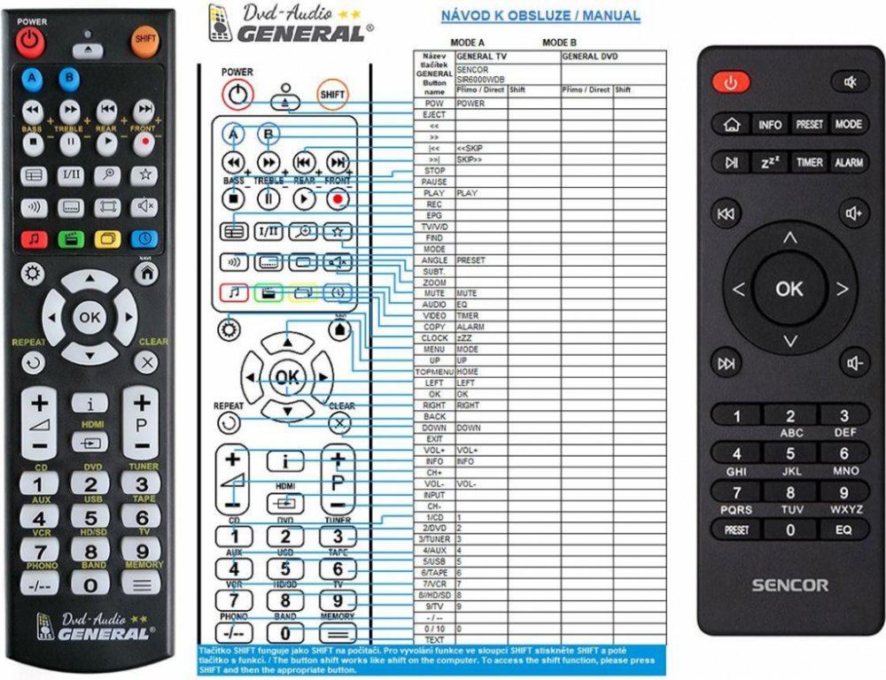 Náhradní dálkový ovladač SENCOR SIR 6000WDB, SIR 5000WDB - 100% náhrada 1:1 za originální dálkový ovladač. Dálkový ovladač je určen pro tyto modely SENCOR:SIR 5000WDB, SIR 6000WDB, SIR5000WDB, SIR6000WDB. (Nemusí zde být uvedeny úplně všechny kompatibilní modely. Pokud si nejste jisti, sdělte nám svůj model (použijte online chat, e-mail, telefon), neprodleně zkontrolujeme a ověříme, zda je tento ovladač kompatibilní s Vaším přístrojem. Za poskytnutou informaci ručíme.) Ovladač je dodáván ve verzi značkového dálkového ovladače General DVD/AUDIO (zobrazen vlevo). Garantujeme Vám, že dostanete ovladač, který plně nahradí Váš původní originální ovladač a bude mít naprosto všechny funkce.Není to univerzální ovladač, ale ovladač, který je naprogramován a přímo určen pro modely přístrojů uvedené výše. Není třeba žádné párování, žádné kódy. Obdržíte od nás ovladač, který je připraven k použití - jediné, co musíte udělat, je vložit baterie a ovladač hned funguje. Podívejte se na obrázek ovladače a ujistěte se, že jsou v tabulce všechny funkce jako na původním originálním ovladači. Jedná se o plnohodnotný náhradní dálkový ovladač (není to „univerzál“). Má naprosto všechny funkce přesně jako originální ovladač. Záruční lhůta na ovladač je 2 roky. Dodáván také jednoduchý návod s mapováním funkcí. DOPLŇKOVÁ FUNKCE: Tento dálkový ovladač je možno naprogramovat na 1 další přístroj. Budete moci jedním ovladačem ovládat oba přístroje (např. DVD+TV nebo SOUNDBAR+TV apod.). Pokud nám do komentáře v objednávce napíšete model dalšího přístroje, naprogramujeme Vám ovladač na oba. Za tuto doplňkovou službu bude naúčtován příplatek k ceně ovladače 50 Kč: více informací