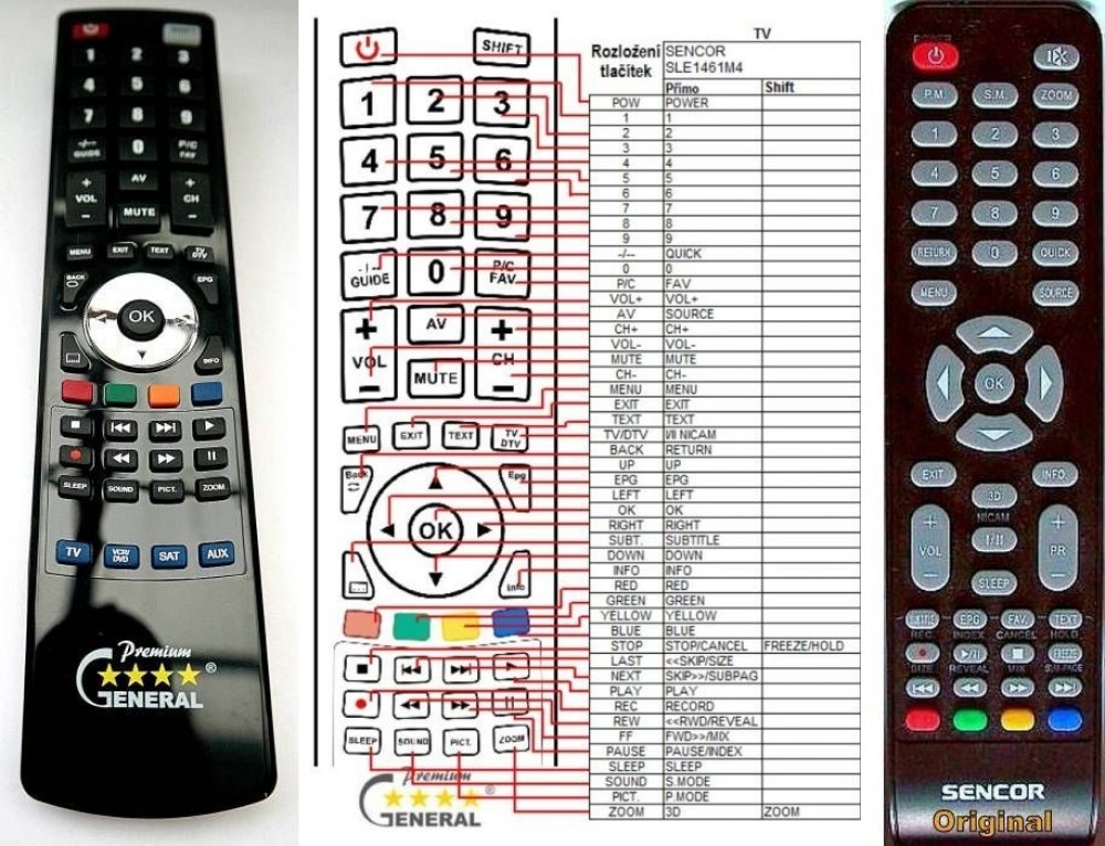 Náhradní dálkový ovladač SENCOR SLE1461M4, SLE43F57, SLE3257 - 100% náhrada 1:1 za originální dálkový ovladač. Dálkový ovladač je určen pro tyto modely SENCOR:SLE 2461TCS, SLE1461M4, SLE2460TCS, SLE2461TC, SLE2461TCS, SLE2464TCS, SLE3224TCS, SLE3257, SLE3257TCS, SLE3258TCS, SLE40F57TCS, SLE43F57, SLE43F57TCS, SLE49F57TCS. (Nemusí zde být uvedeny úplně všechny kompatibilní modely. Pokud si nejste jisti, sdělte nám svůj model (použijte online chat, e-mail, telefon), neprodleně zkontrolujeme a ověříme, zda je tento ovladač kompatibilní s Vaším přístrojem. Za poskytnutou informaci ručíme.) Ovladač je dodáván ve verzi značkového dálkového ovladače General Premium (zobrazen vlevo). Garantujeme Vám, že dostanete ovladač, který plně nahradí Váš původní originální ovladač a bude mít naprosto všechny funkce stejné.Není to univerzální ovladač, ale ovladač, který je naprogramován a přímo určen pro modely přístrojů uvedené výše. Není třeba žádné párování, žádné kódy. Obdržíte od nás ovladač, který je připraven k použití - jediné, co musíte udělat, je vložit baterie a ovladač hned funguje. Podívejte se na obrázek ovladače a ujistěte se, že jsou v tabulce všechny funkce jako na původním originálním ovladači. Jedná se o plnohodnotný náhradní dálkový ovladač (není to „univerzál“). Má naprosto všechny funkce přesně jako originální ovladač. Záruční lhůta na ovladač je 2 roky. Dodáván také jednoduchý návod s mapováním funkcí. DOPLŇKOVÁ FUNKCE: Tento dálkový ovladač je možno naprogramovat na 1-4 zařízení (celkem tedy 4). Budete moci jedním ovladačem ovládat několik různých přístrojů jedním ovladačem. Pokud nám do komentáře v objednávce napíšete modely dalších přístrojů, naprogramujeme Vám ovladač na všechny. Za tuto doplňkovou službu bude naúčtován příplatek k ceně ovladače 50 Kč: více informacíV případě, že v budoucnu vyměníte/obměníte Vaši domácí elektroniku, jsme schopni Vám tento ovladač přeprogramovat na naprosto jakékoliv nové/á zařízení. Ovladač General přežije ..