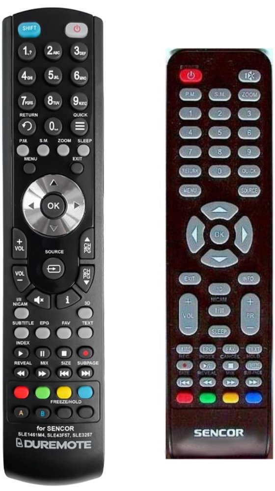 Náhradní dálkový ovladač SENCOR SLE1461M4, SLE43F57, SLE3257 - 100% náhrada 1:1 za originální dálkový ovladač. Dálkový ovladač je určen pro tyto modely SENCOR:SLE 2461TCS, SLE1461M4, SLE2460TCS, SLE2461TC, SLE2461TCS, SLE2464TCS, SLE3224TCS, SLE3257, SLE3257TCS, SLE3258TCS, SLE40F57TCS, SLE43F57, SLE43F57TCS, SLE49F57TCS. (Nemusí zde být uvedeny úplně všechny kompatibilní modely. Pokud si nejste j...