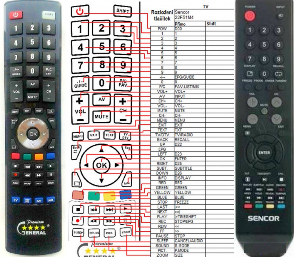 Náhradní dálkový ovladač SENCOR SLE22F50T, SLE22F51M4, SLE1950T - 100% náhrada 1:1 za originální dálkový ovladač. Dálkový ovladač byl vyvinut speciálně na míru pro tyto modely značky SENCOR:SLE 2651M4, SLE-1950T, SLE-2250T, SLE-22F50T, SLE-22F51M4 TITANIUM, SLE-2650T, SLE-3250T, SLE1950T, SLE1951M4, SLE2250T, SLE22F51M4 TITANIUM, SLE2452M4 SE, SLE2452M4SE, SLE24F50T, SLE24F51M4 TITANIUM (ONLY TITANIUM - NOT SLE-22F51M4 SILVER), SLE2650T, SLE3250T, SLE3251M4, SLT-39F29DVBT, SLT39F29DVBT. (Nemusí zde být uvedeny úplně všechny kompatibilní modely. Pokud si nejste jisti, sdělte nám svůj model (použijte online chat, e-mail, telefon), neprodleně zkontrolujeme a ověříme, zda je tento ovladač kompatibilní s Vaším přístrojem. Za poskytnutou informaci ručíme.) Ovladač je dodáván ve verzi značkového dálkového ovladače General Premium (zobrazen vlevo). Garantujeme Vám, že dostanete ovladač, který plně nahradí Váš původní originální ovladač a bude mít naprosto všechny funkce stejné.Není to univerzální ovladač, ale ovladač, který je naprogramován a přímo určen pro modely přístrojů uvedené výše. Není třeba žádné párování, žádné kódy. Obdržíte od nás ovladač, který je připraven k použití - jediné, co musíte udělat, je vložit baterie a ovladač hned funguje. Podívejte se na obrázek ovladače a ujistěte se, že jsou v tabulce všechny funkce jako na původním originálním ovladači. Jedná se o plnohodnotný náhradní dálkový ovladač (není to „univerzál“). Má naprosto všechny funkce přesně jako originální ovladač. Záruční lhůta na ovladač je 3 roky. Dodáván také jednoduchý návod s mapováním funkcí. DOPLŇKOVÁ FUNKCE: Tento dálkový ovladač je možno naprogramovat na 1-4 zařízení (celkem tedy 4). Budete moci jedním ovladačem ovládat několik různých přístrojů jedním ovladačem. Pokud nám do komentáře v objednávce napíšete modely dalších přístrojů, naprogramujeme Vám ovladač na všechny. Za tuto doplňkovou službu bude naúčtován příplatek k ceně ovladače 50 Kč: více informacíV případě..