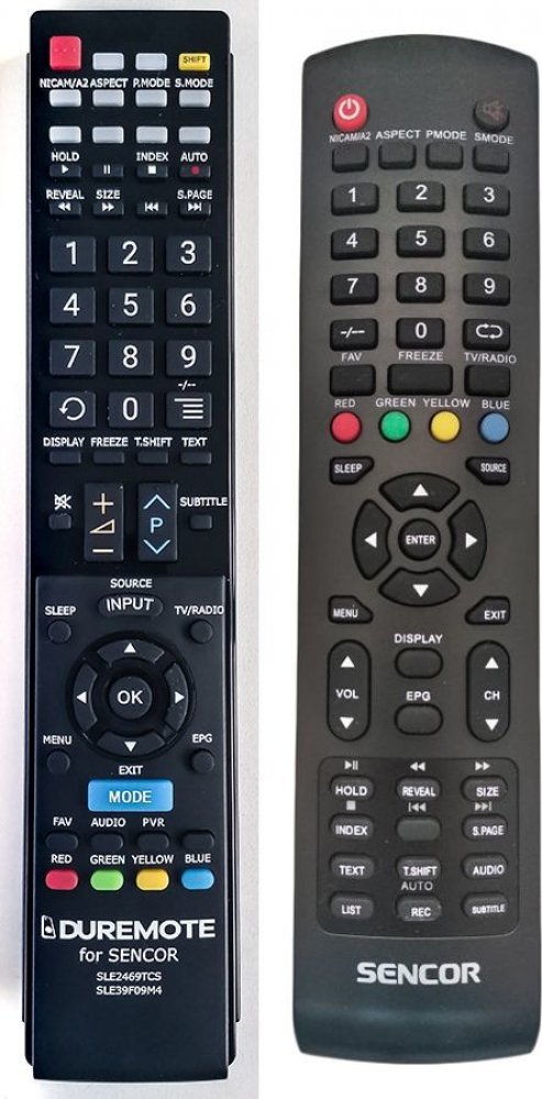 Dálkový ovladač SENCOR SLE3209M4, SLE39F09M4, SLE2468TCS, SLE2469TCS duplikát 1:1 originálního dálkového ovladače. Dálkový ovladač byl vyvinut speciálně na míru pro tyto modely značky SENCOR:SLE-3209M4, SLE-39F09M, SLE-40F16TCS, SLE-42F16TCS, SLE-43F16TCS, SLE2468TCS, SLE2469TCS, SLE3209M4, SLE3226TCS, SLE39F09M4, SLE40F16TCS, SLE42F16TCS, SLE43F16TCS. (Nemusí zde být uvedeny úplně všechny kompatibilní modely. Pokud si nejste jisti, sdělte nám svůj model (použijte online chat, e-mail, telefon), neprodleně zkontrolujeme a ověříme, zda je tento ovladač kompatibilní s Vaším přístrojem. Za poskytnutou informaci ručíme.) Dálkový ovladač General Duremote má naprosto všechny funkce a popisky tlačítek stejné jako originální dálkový ovladač. Není třeba nic nastavovat, žádné kódy, funguje ihned po vložení baterií se všemi výše uvedenými modely.Ovladač je dodáván ve verzi značkového dálkového ovladače General Duremote (zobrazen vlevo) Jedná se o ovladač vyrobený pro specifické zařízení – NENÍ to univerzální ovladač! Má naprosto všechny funkce jako originální dálkový ovladač. Má stejné popisky tlačítek, jako jste byli zvyklí z originálu. Popisky tlačítek jsou velmi odolné a nejdou seškrábat ani hrubou silou. 3 roky záruka.General Duremote byl navržen a vyroben přesně podle originálního dálkového ovladače tlačítko po tlačítku. Ovladač je vyvinut a testován v České republice a podléhá CE a ROHS standardům. SNADNÉ INTUITIVNÍ POUŽÍVÁNÍ: Na rozdíl od běžných náhradních ovladačů, General Duremote má 100% odpovídající popisky tlačítek jako na originálním ovladači. Srovnání: Jiné univerzální nebo programovatelné náhrady mají kvůli snížení nákladů názvy/popisky a rozložení tlačítek univerzální, popisky tlačítek často neodpovídají funkci tlačítka a vyžadují tedy návody k použití. To často vede k nejasnostem, co které tlačítko dělá a stálá potřeba manuálu je velmi obtěžující. S ovladačem General Duremote žádný návod nepotřebujete, tlačítko dělá přesně to, co symbolizuje jeho popisek.GARANTUJEM..