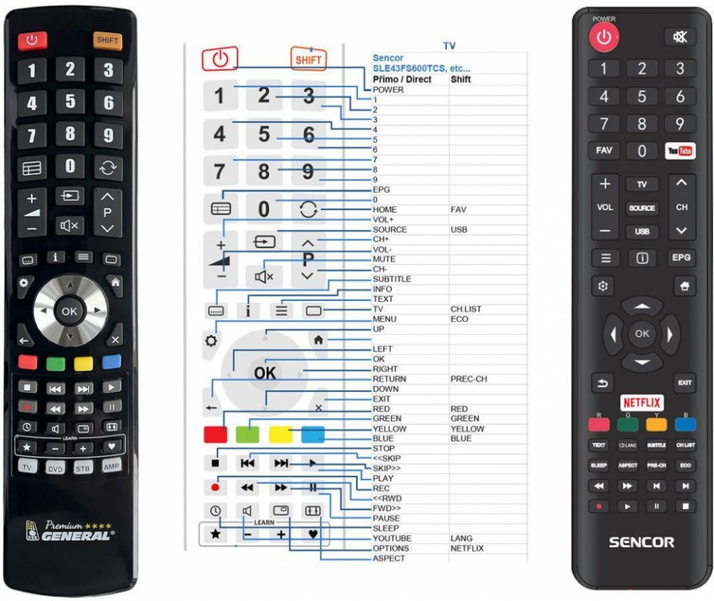 Náhradní dálkový ovladač SENCOR SLE43FS600TCS, SLE43US600TCS, SLE49US600TCS, SLE55US600TCS - 100% náhrada 1:1 za originální dálkový ovladač. Dokonalá 1:1 kopie navržená a vyrobená naší firmou – má všechny funkce originálního ovladače pro tyto modely značky SENCOR:SLE43FS600TCS, SLE43US600TCS, SLE49US600TCS, SLE55US600TCS. (Nemusí zde být uvedeny úplně všechny kompatibilní modely. Pokud si nejste jisti, sdělte nám svůj model (použijte online chat, e-mail, telefon), neprodleně zkontrolujeme a ověříme, zda je tento ovladač kompatibilní s Vaším přístrojem. Za poskytnutou informaci ručíme.) Ovladač je dodáván ve verzi značkového dálkového ovladače General Premium (zobrazen vlevo). Garantujeme Vám, že dostanete ovladač, který plně nahradí Váš původní originální ovladač a bude mít naprosto všechny funkce stejné.Není to univerzální ovladač, ale ovladač, který je naprogramován a přímo určen pro modely přístrojů uvedené výše. Není třeba žádné párování, žádné kódy. Obdržíte od nás ovladač, který je připraven k použití - jediné, co musíte udělat, je vložit baterie a ovladač hned funguje. Podívejte se na obrázek ovladače a ujistěte se, že jsou v tabulce všechny funkce jako na původním originálním ovladači. Jedná se o plnohodnotný náhradní dálkový ovladač (není to „univerzál“). Má naprosto všechny funkce přesně jako originální ovladač. Záruční lhůta na ovladač je 3 roky. Dodáván také jednoduchý návod s mapováním funkcí. DOPLŇKOVÁ FUNKCE: Tento dálkový ovladač je možno naprogramovat na 1-4 zařízení (celkem tedy 4). Budete moci jedním ovladačem ovládat několik různých přístrojů jedním ovladačem. Pokud nám do komentáře v objednávce napíšete modely dalších přístrojů, naprogramujeme Vám ovladač na všechny. Za tuto doplňkovou službu bude naúčtován příplatek k ceně ovladače 50 Kč: více informacíV případě, že v budoucnu vyměníte/obměníte Vaši domácí elektroniku, jsme schopni Vám tento ovladač přeprogramovat na naprosto jakékoliv nové/á zařízení. Ovladač General přežije V..