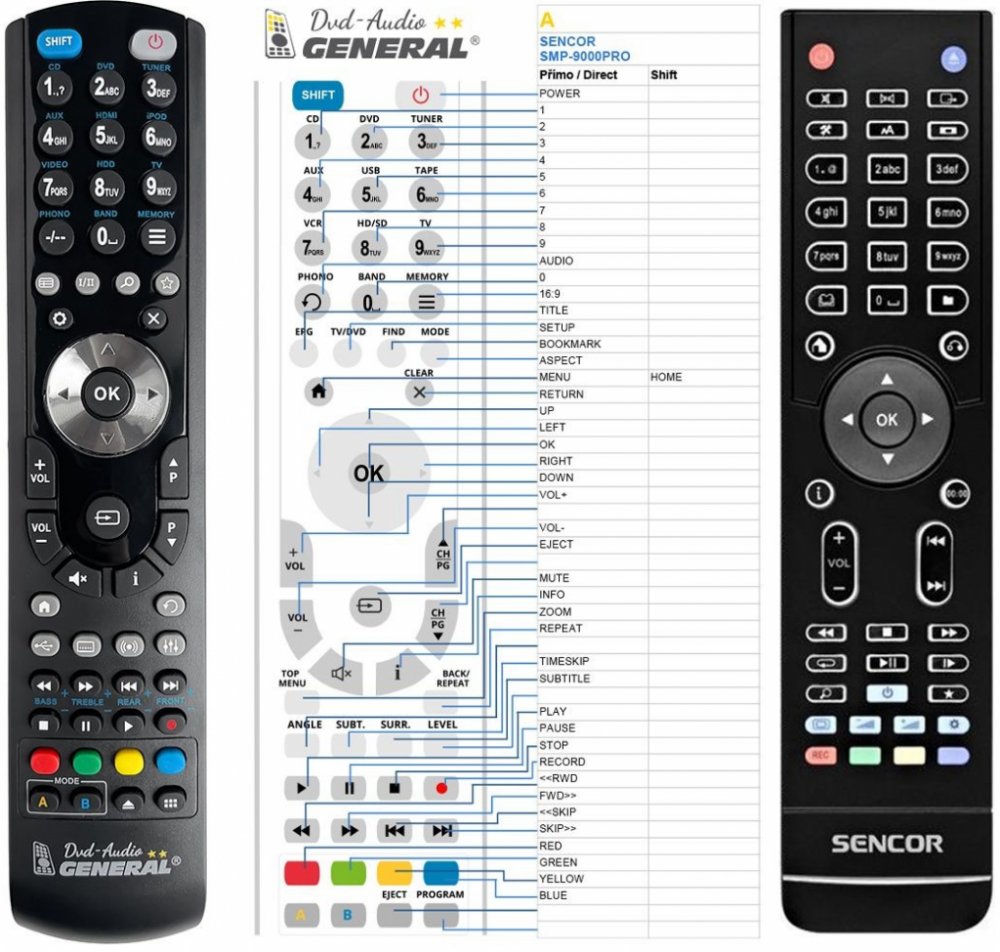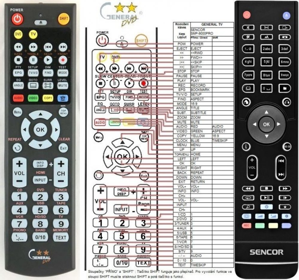 Náhradní dálkový ovladač SENCOR SMP9000 PRO - 100% náhrada 1:1 za originální dálkový ovladač. Dálkový ovladač byl vyvinut speciálně na míru pro tyto modely značky SENCOR:SMP-9000 PRO, SMP-9000PRO, SMP9000 PRO, SMP9000PRO. (Nemusí zde být uvedeny úplně všechny kompatibilní modely. Pokud si nejste jisti, sdělte nám svůj model (použijte online chat, e-mail, telefon), neprodleně zkontrolujeme a ověříme, zda je tento ovladač kompatibilní s Vaším přístrojem. Za poskytnutou informaci ručíme.) Ovladač je dodáván ve verzi značkového dálkového ovladače General DVD/AUDIO (zobrazen vlevo). Garantujeme Vám, že dostanete ovladač, který plně nahradí Váš původní originální ovladač a bude mít naprosto všechny funkce stejné.Není to univerzální ovladač, ale ovladač, který je naprogramován a přímo určen pro modely přístrojů uvedené výše. Není třeba žádné párování, žádné kódy. Obdržíte od nás ovladač, který je připraven k použití - jediné, co musíte udělat, je vložit baterie a ovladač hned funguje. Podívejte se na obrázek ovladače a ujistěte se, že jsou v tabulce všechny funkce jako na původním originálním ovladači. Jedná se o plnohodnotný náhradní dálkový ovladač (není to „univerzál“). Má naprosto všechny funkce přesně jako originální ovladač. Záruční lhůta na ovladač je 3 roky. Dodáván také jednoduchý návod s mapováním funkcí. DOPLŇKOVÁ FUNKCE: Tento dálkový ovladač je možno naprogramovat na 1 další přístroj. Budete moci jedním ovladačem ovládat oba přístroje (např. DVD+TV nebo SOUNDBAR+TV apod.). Pokud nám do komentáře v objednávce napíšete model dalšího přístroje, naprogramujeme Vám ovladač na oba. Za tuto doplňkovou službu bude naúčtován příplatek k ceně ovladače 50 Kč: více informací