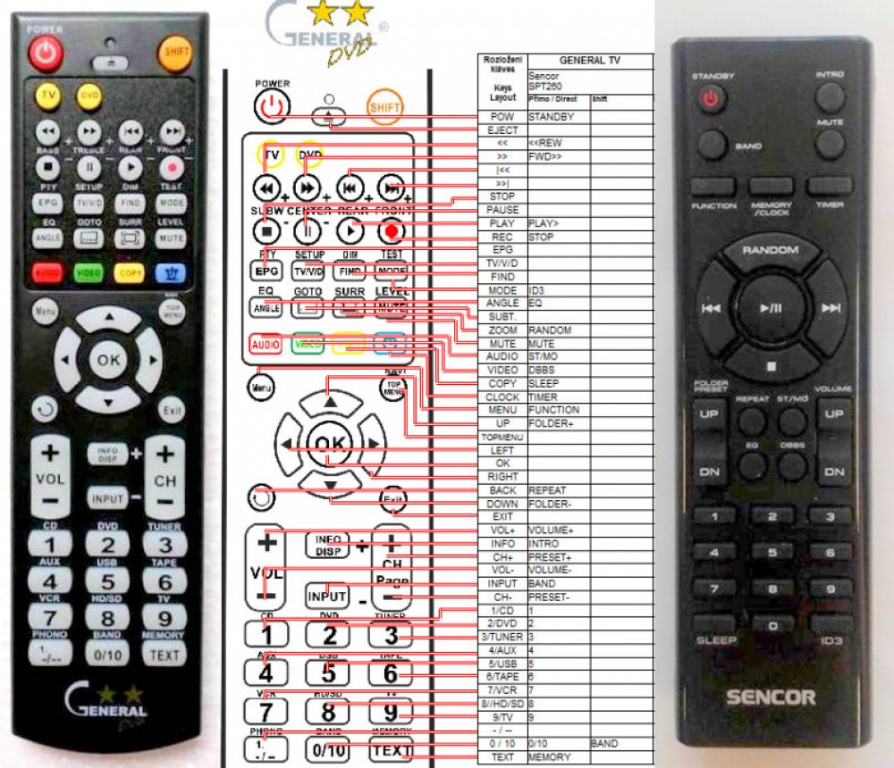Náhradní dálkový ovladač SENCOR SPT260 - 100% náhrada 1:1 za originální dálkový ovladač. Dálkový ovladač byl vyvinut speciálně na míru pro tyto modely značky SENCOR:SPT-260, SPT260. (Nemusí zde být uvedeny úplně všechny kompatibilní modely. Pokud si nejste jisti, sdělte nám svůj model (použijte online chat, e-mail, telefon), neprodleně zkontrolujeme a ověříme, zda je tento ovladač kompatibilní s Vaším přístrojem. Za poskytnutou informaci ručíme.) Ovladač je dodáván ve verzi značkového dálkového ovladače General DVD/AUDIO (zobrazen vlevo). Garantujeme Vám, že dostanete ovladač, který plně nahradí Váš původní originální ovladač a bude mít naprosto všechny funkce stejné.Není to univerzální ovladač, ale ovladač, který je naprogramován a přímo určen pro modely přístrojů uvedené výše. Není třeba žádné párování, žádné kódy. Obdržíte od nás ovladač, který je připraven k použití - jediné, co musíte udělat, je vložit baterie a ovladač hned funguje. Podívejte se na obrázek ovladače a ujistěte se, že jsou v tabulce všechny funkce jako na původním originálním ovladači. Jedná se o plnohodnotný náhradní dálkový ovladač (není to „univerzál“). Má naprosto všechny funkce přesně jako originální ovladač. Záruční lhůta na ovladač je 3 roky. Dodáván také jednoduchý návod s mapováním funkcí. DOPLŇKOVÁ FUNKCE: Tento dálkový ovladač je možno naprogramovat na 1 další přístroj. Budete moci jedním ovladačem ovládat oba přístroje (např. DVD+TV nebo SOUNDBAR+TV apod.). Pokud nám do komentáře v objednávce napíšete model dalšího přístroje, naprogramujeme Vám ovladač na oba. Za tuto doplňkovou službu bude naúčtován příplatek k ceně ovladače 50 Kč: více informací