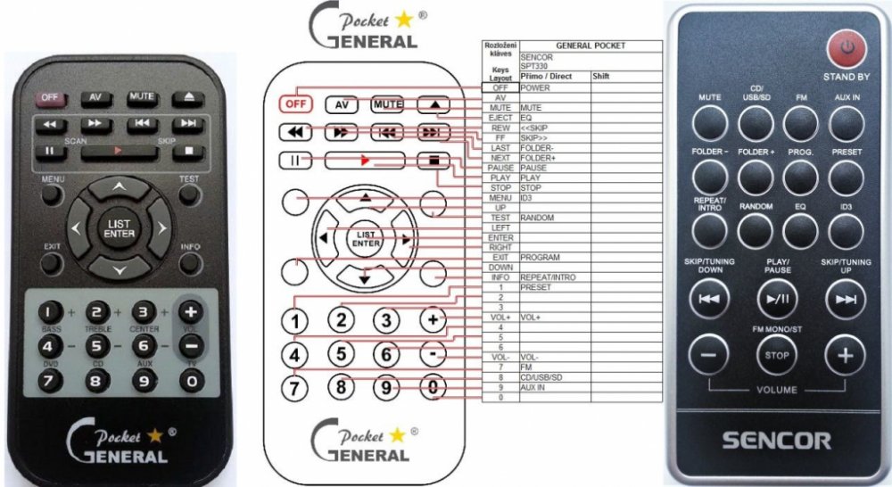 Náhradní dálkový ovladač SENCOR SPT330 - 100% náhrada 1:1 za originální dálkový ovladač. Dálkový ovladač byl vyvinut speciálně na míru pro tyto modely značky SENCOR:SPT-330, SPT330. (Nemusí zde být uvedeny úplně všechny kompatibilní modely. Pokud si nejste jisti, sdělte nám svůj model (použijte online chat, e-mail, telefon), neprodleně zkontrolujeme a ověříme, zda je tento ovladač kompatibilní s Vaším přístrojem. Za poskytnutou informaci ručíme.) Ovladač je dodáván ve verzi značkového dálkového ovladače General POCKET (zobrazen vlevo). Garantujeme Vám, že dostanete ovladač, který plně nahradí Váš původní originální ovladač a bude mít naprosto všechny funkce stejné.Není to univerzální ovladač, ale ovladač, který je naprogramován a přímo určen pro modely přístrojů uvedené výše. Není třeba žádné párování, žádné kódy. Obdržíte od nás ovladač, který je připraven k použití - jediné, co musíte udělat, je vložit baterie a ovladač hned funguje. Podívejte se na obrázek ovladače a ujistěte se, že jsou v tabulce všechny funkce jako na původním originálním ovladači. Jedná se o plnohodnotný náhradní dálkový ovladač (není to „univerzál“). Má naprosto všechny funkce přesně jako originální ovladač. Záruční lhůta na ovladač je 3 roky. Dodáván také jednoduchý návod s mapováním funkcí.